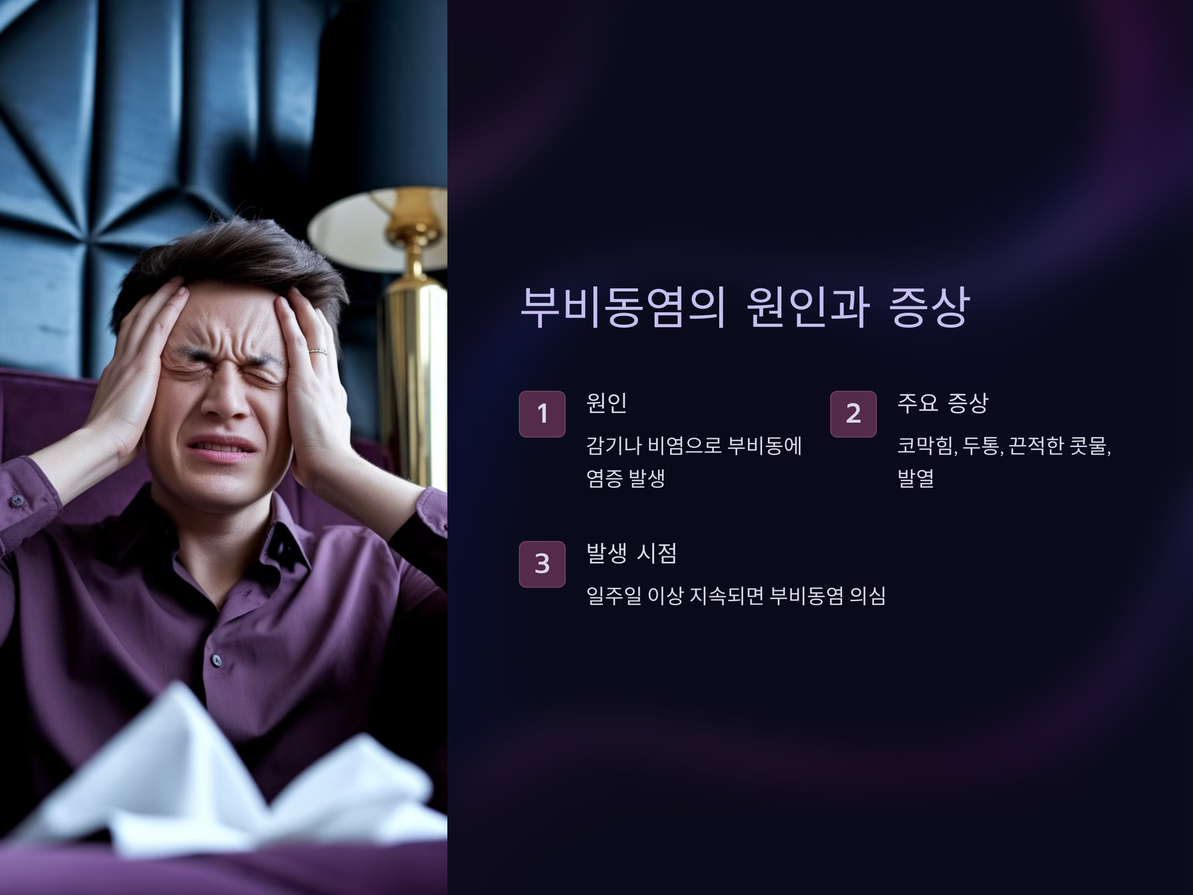 부비동염은 주로 감기나 비염 등으로 인해 부비동에 염증이 생기는 질환입니다. 이 염증이 장기화되면 부비동이 막히고, 통증이나 불쾌감을 유발합니다. 부비동염의 주요 증상으로는 다음과 같습니다: