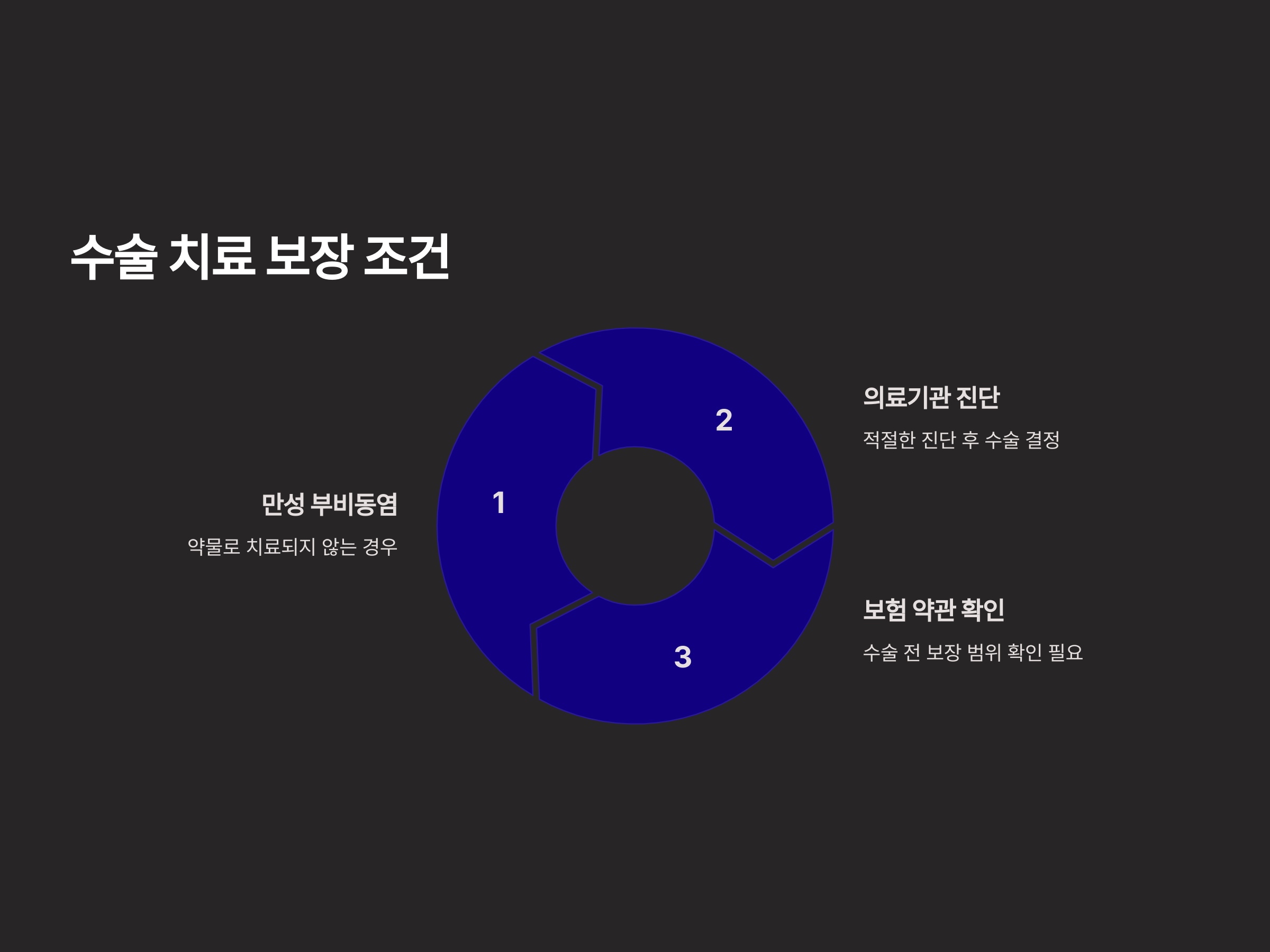 수술비용은 실손보험에서 보장받을 수 있습니다. 부비동염이 만성화되어 수술이 필요할 경우, 수술비용에 대한 보장은 대부분의 실손보험 상품에 포함됩니다. 다만, 특정 조건에 따라 수술비용의 일부만 보장되거나, 병원과의 계약에 따라 차이가 있을 수 있습니다. 예를 들어, 병원의 종류나 수술 방법에 따라 보장이 달라질 수 있기 때문에, 수술 전에 보험 약관을 꼼꼼히 살펴보는 것이 필요합니다.