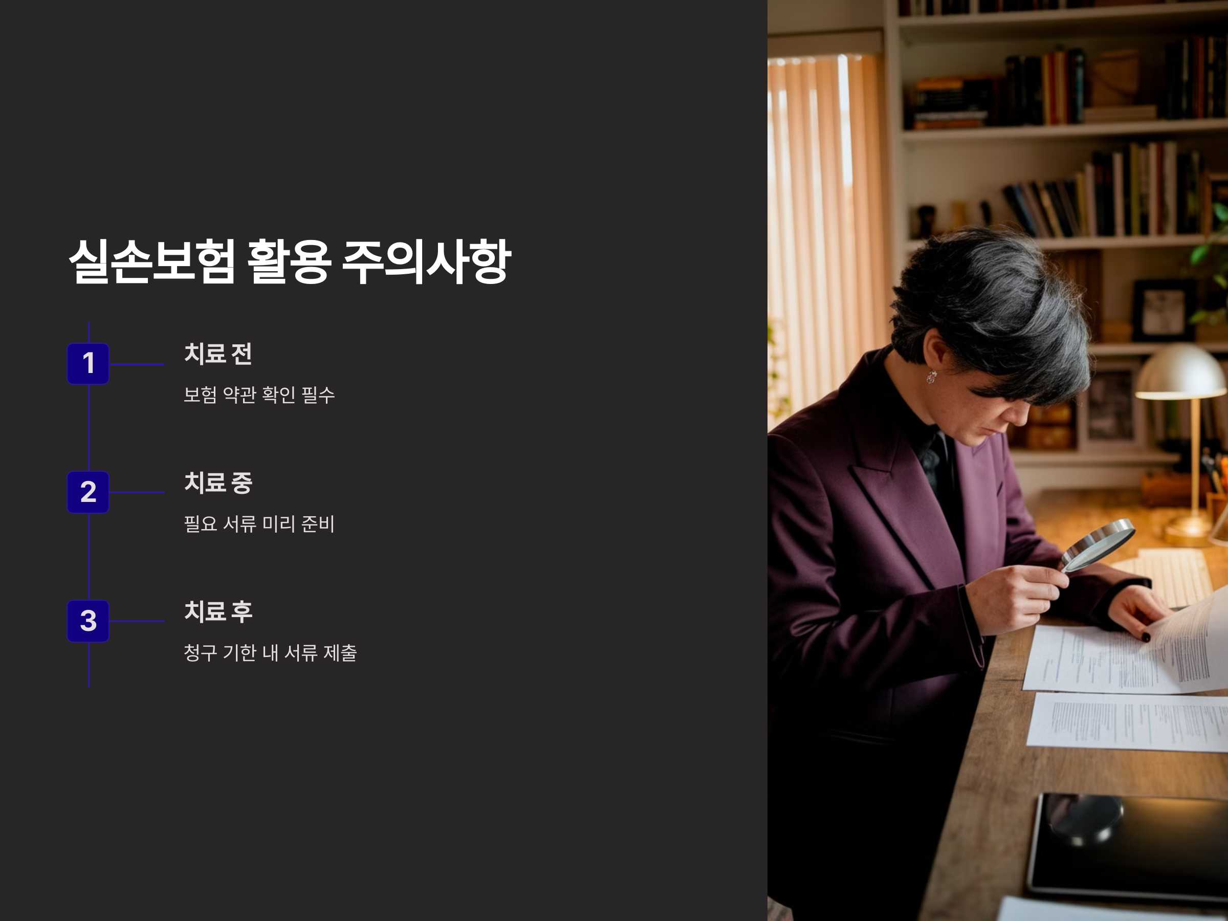 실손보험을 통한 치료비 청구 시, 병원에서 제공한 진료내역서와 약제비 내역서를 제출해야 합니다. 또한 보험 가입 시 제공된 약관에 맞는 치료 항목에 대한 청구만 가능하므로, 치료 전 보험사에 문의하여 적용 가능한 항목에 대해 확인하는 것이 좋습니다.