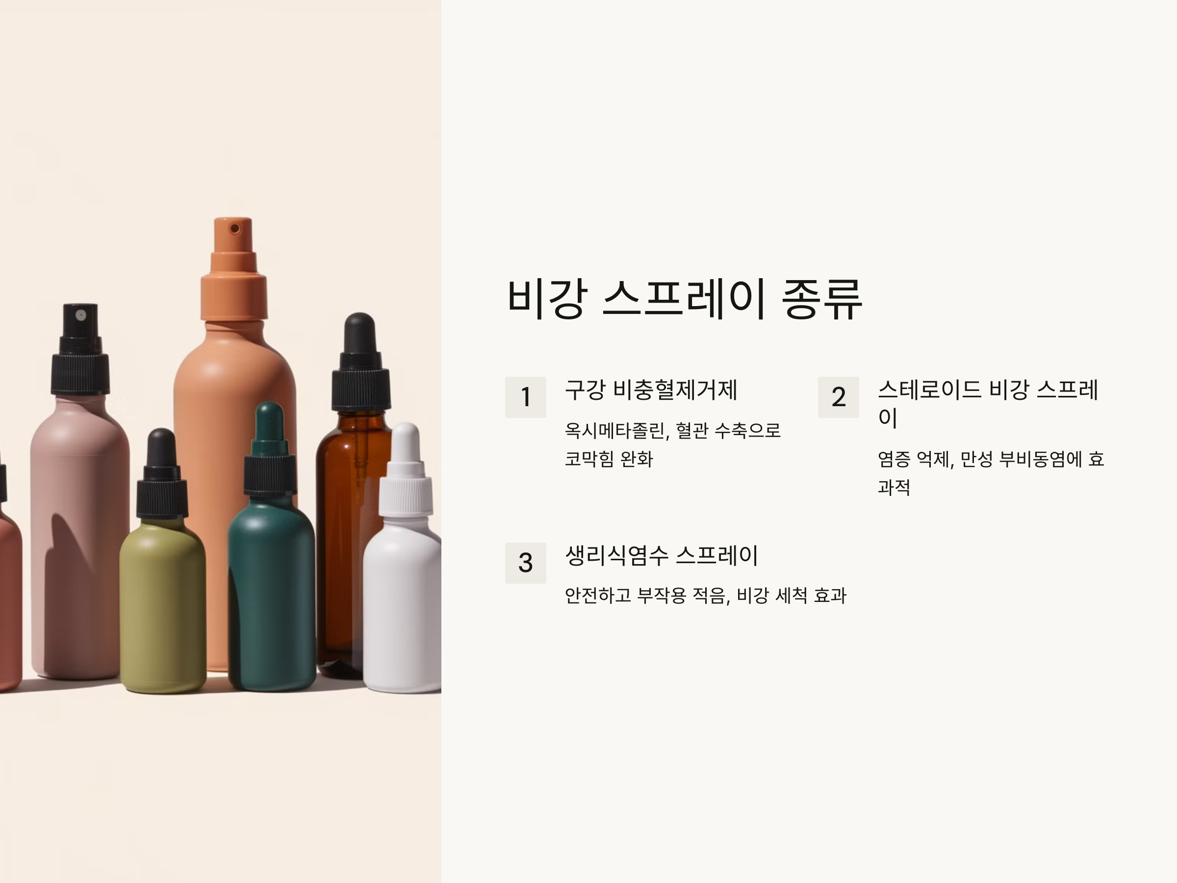 - 생리식염수 스프레이: 가장 안전하고 부작용이 적은 스프레이로, 비강을 세척하여 점액을 제거하고 코를 청결하게 유지하는 데 사용됩니다.