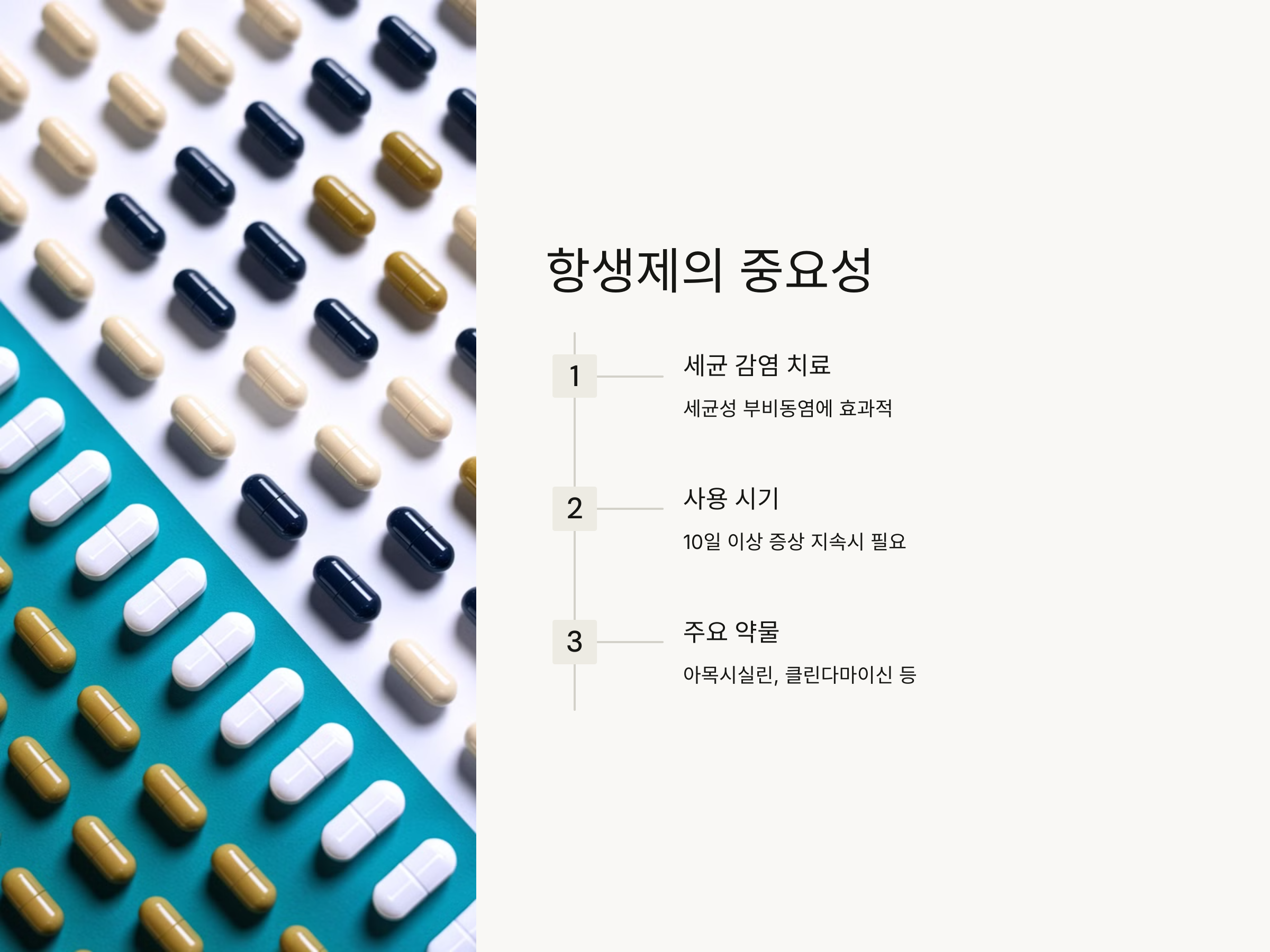 항생제를 사용할 때는 반드시 의사의 처방을 받아야 하며, 지정된 기간 동안 약을 꾸준히 복용해야 합니다. 중간에 약 복용을 중단하거나, 사용을 거르지 않도록 주의해야 하며, 약물에 대한 알레르기 반응이 있을 경우 즉시 사용을 중지해야 합니다. 또한, 부작용을 최소화하려면 의사의 지시를 정확히 따르는 것이 중요합니다.