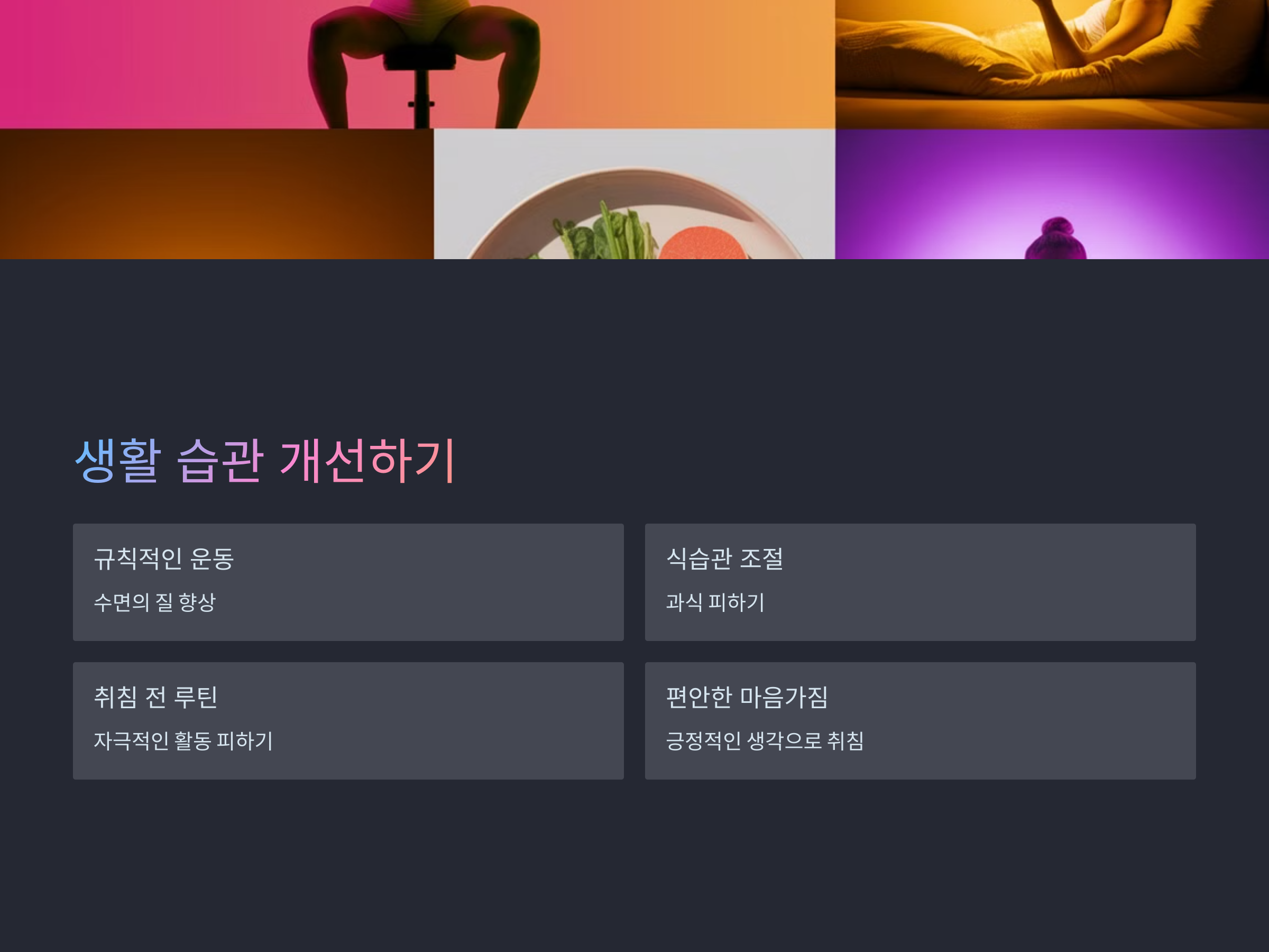 수면 환경을 조성하는 것이 중요합니다. 방은 어둡고 조용하며, 적당한 온도로 유지해야 합니다. 또한, 침대와 베개가 편안한지 점검하고, 스마트폰이나 전자기기에서 나오는 블루라이트를 피하는 것도 좋은 방법입니다.