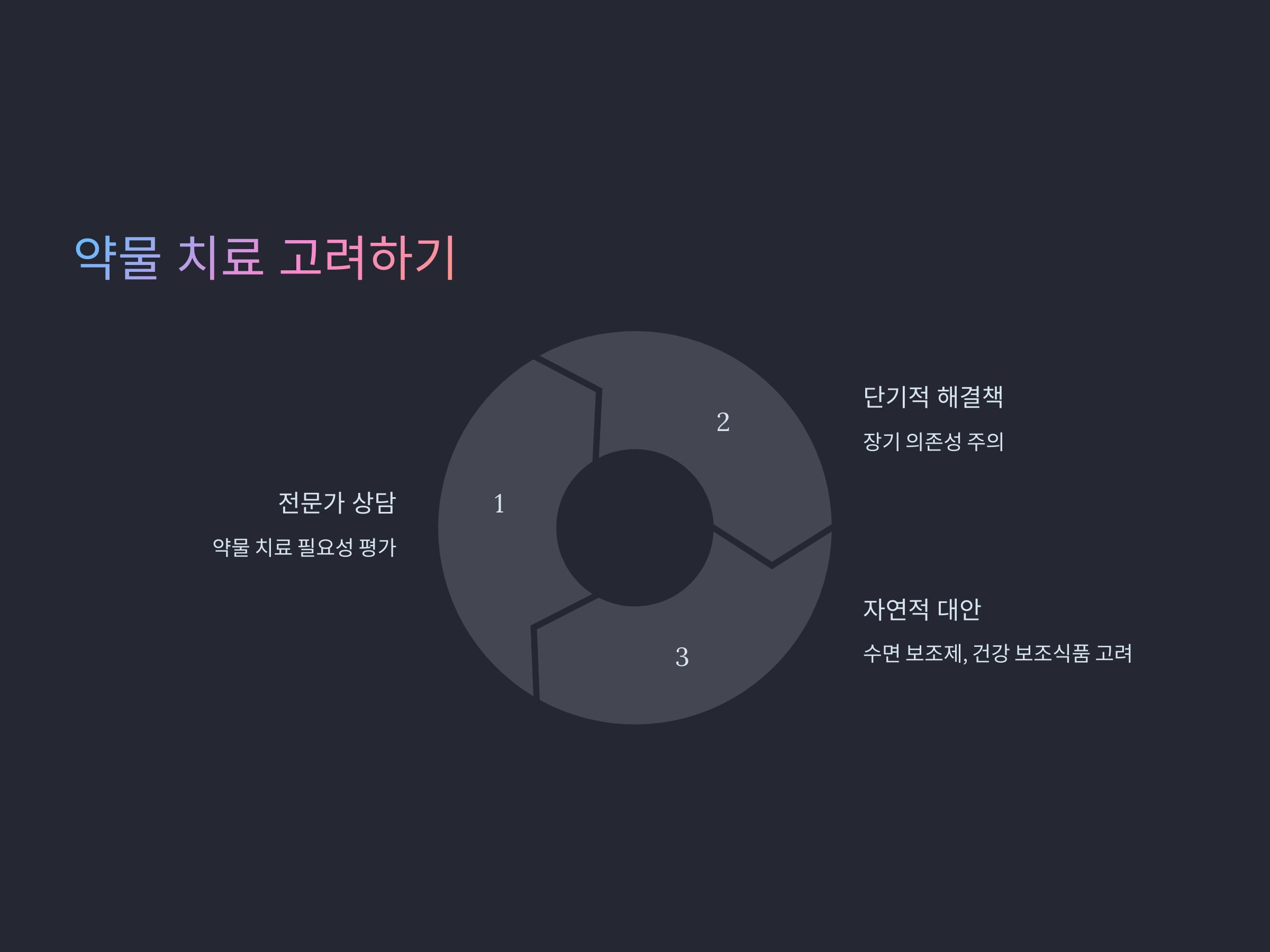 불면증이 심각해지면, 약물 치료가 필요할 수 있습니다. 그러나 약물 치료는 전문가와 상담 후에 이루어져야 하며, 단기적인 해결책으로만 사용해야 합니다. 장기적으로 약물 의존성이 생기지 않도록 주의해야 합니다. 약물 외에도 자연적인 수면 보조제나 건강 보조식품을 고려할 수도 있습니다.