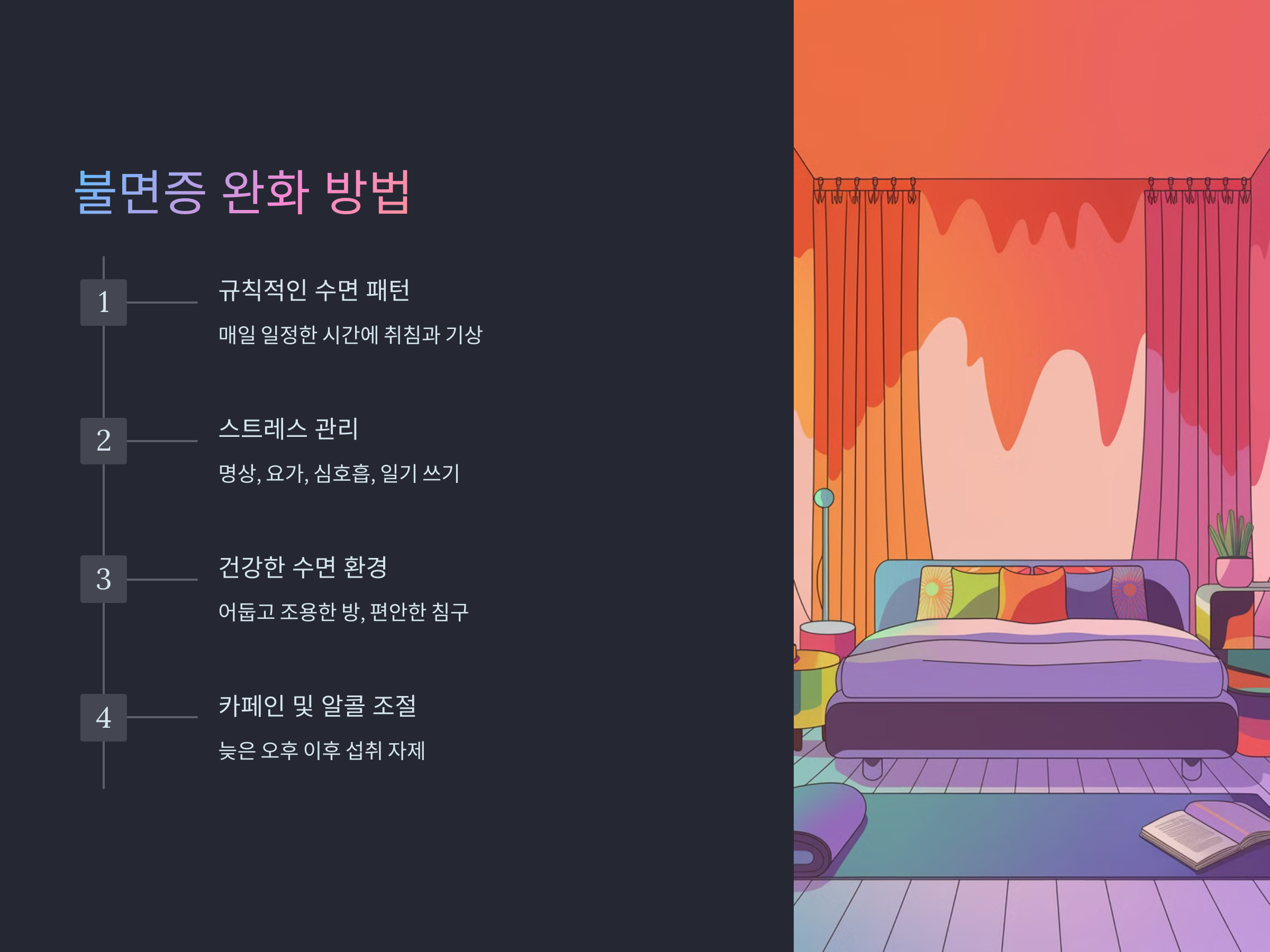 불면증을 완화하려면, 건강한 생활 습관을 유지하는 것이 중요합니다. 규칙적인 운동은 수면의 질을 높여주며, 과식이나 과도한 운동은 잠을 방해할 수 있습니다. 또한, 잠자리에 들기 전에는 자극적인 활동을 피하고, 몸과 마음을 편안하게 만들어야 합니다.