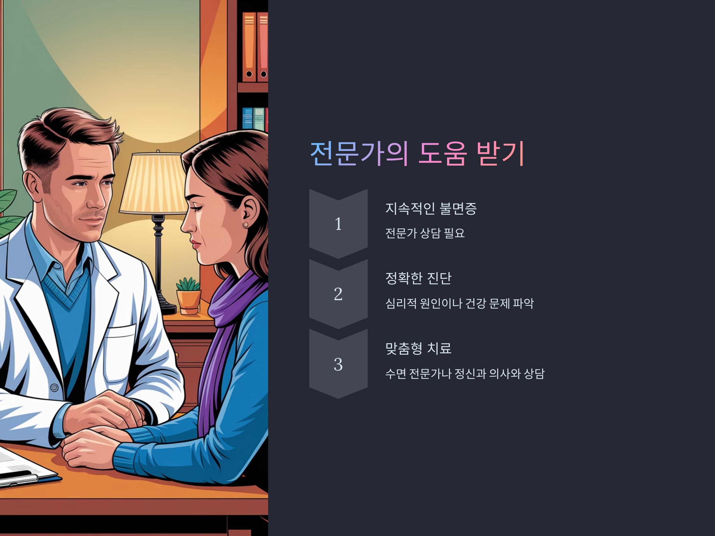 새벽에 자주 깨어나는 불면증이 지속된다면, 전문가의 도움을 받는 것이 중요합니다. 심리적인 원인이나 건강 문제로 인한 불면증일 경우, 전문적인 진단과 치료가 필요할 수 있습니다. 수면 전문가나 정신과 의사와 상담하여 원인을 정확히 파악하고, 맞춤형 치료를 받는 것이 가장 효과적입니다.