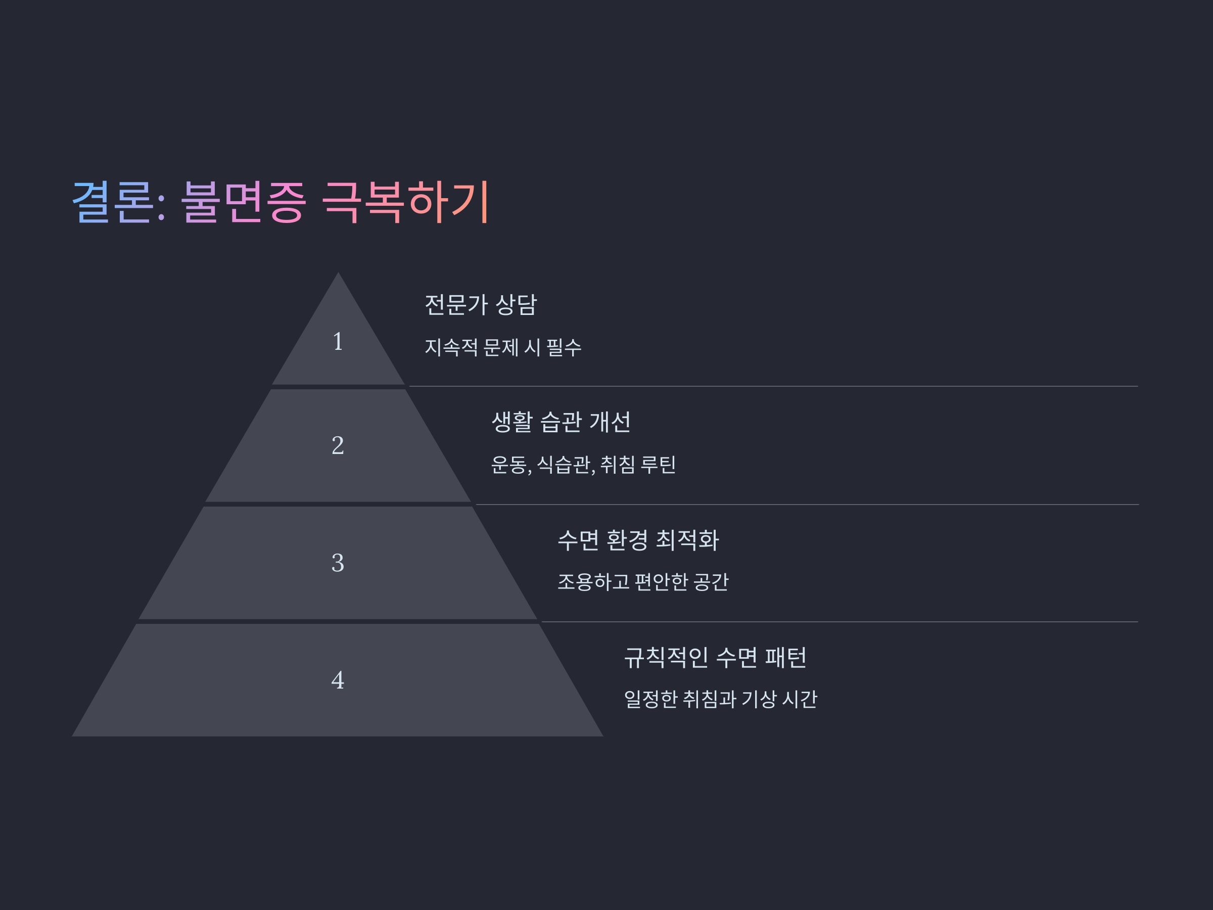 불면증과 새벽에 자주 깨어나는 문제는 여러 가지 원인에 의해 발생할 수 있습니다. 그러나 이를 해결하는 방법은 충분히 존재하며, 자신의 생활 습관을 개선하고, 전문가의 도움을 받는 것이 중요한 해결책입니다. 일상적인 수면 패턴을 유지하고, 스트레스를 줄이며, 건강한 환경을 만드는 것만으로도 큰 차이를 느낄 수 있을 것입니다.