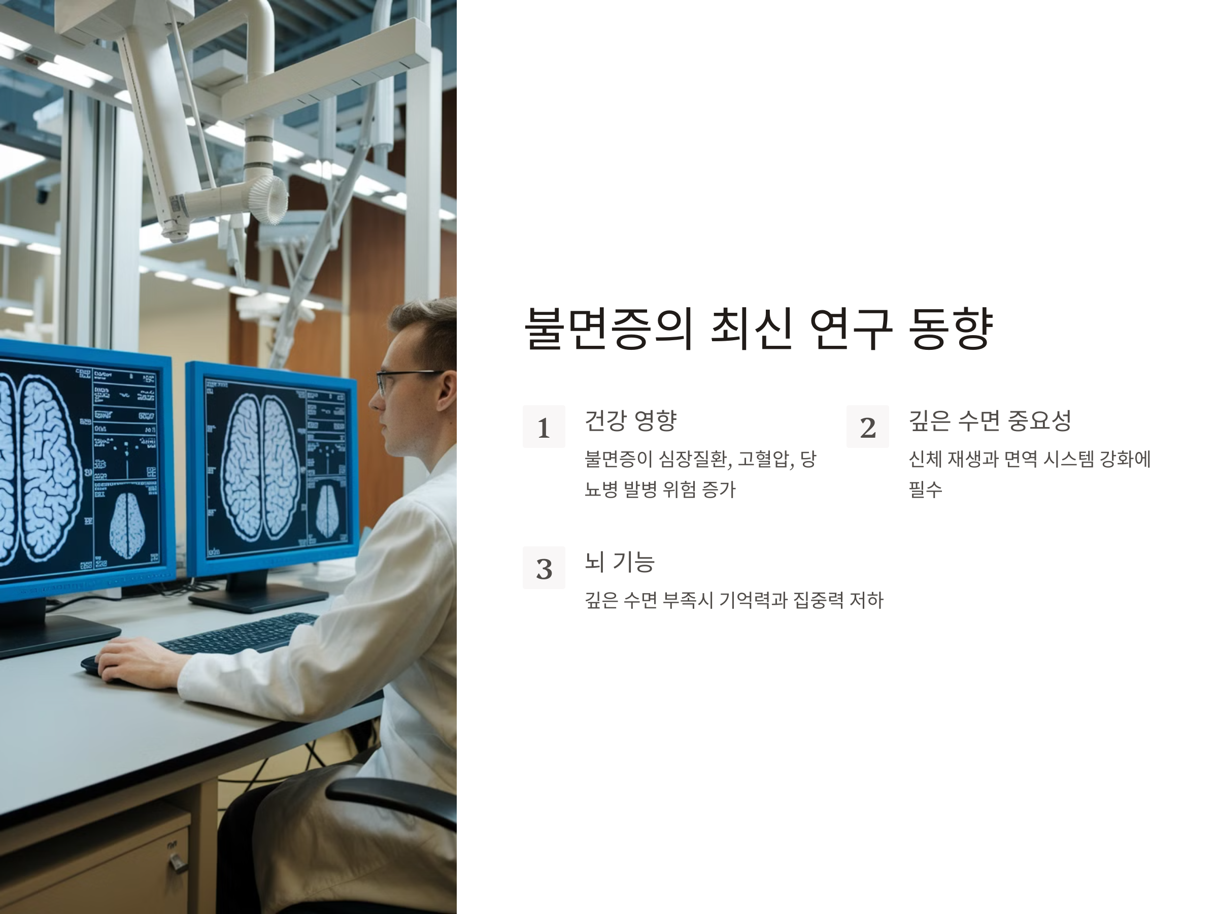 최근 연구에 따르면, 불면증과 깊은 수면 부족은 단지 피로와 무기력함을 넘어서, 만성적인 질병을 유발할 수 있는 주요 원인으로 지목되고 있습니다. 불면증은 단순히 잠을 잘 못 자는 것이 아니라, 신체와 정신에 다양한 영향을 미칠 수 있습니다. 예를 들어, 불면증은 심장 질환, 고혈압, 당뇨병 등 다양한 만성 질환의 발병 위험을 높일 수 있습니다.