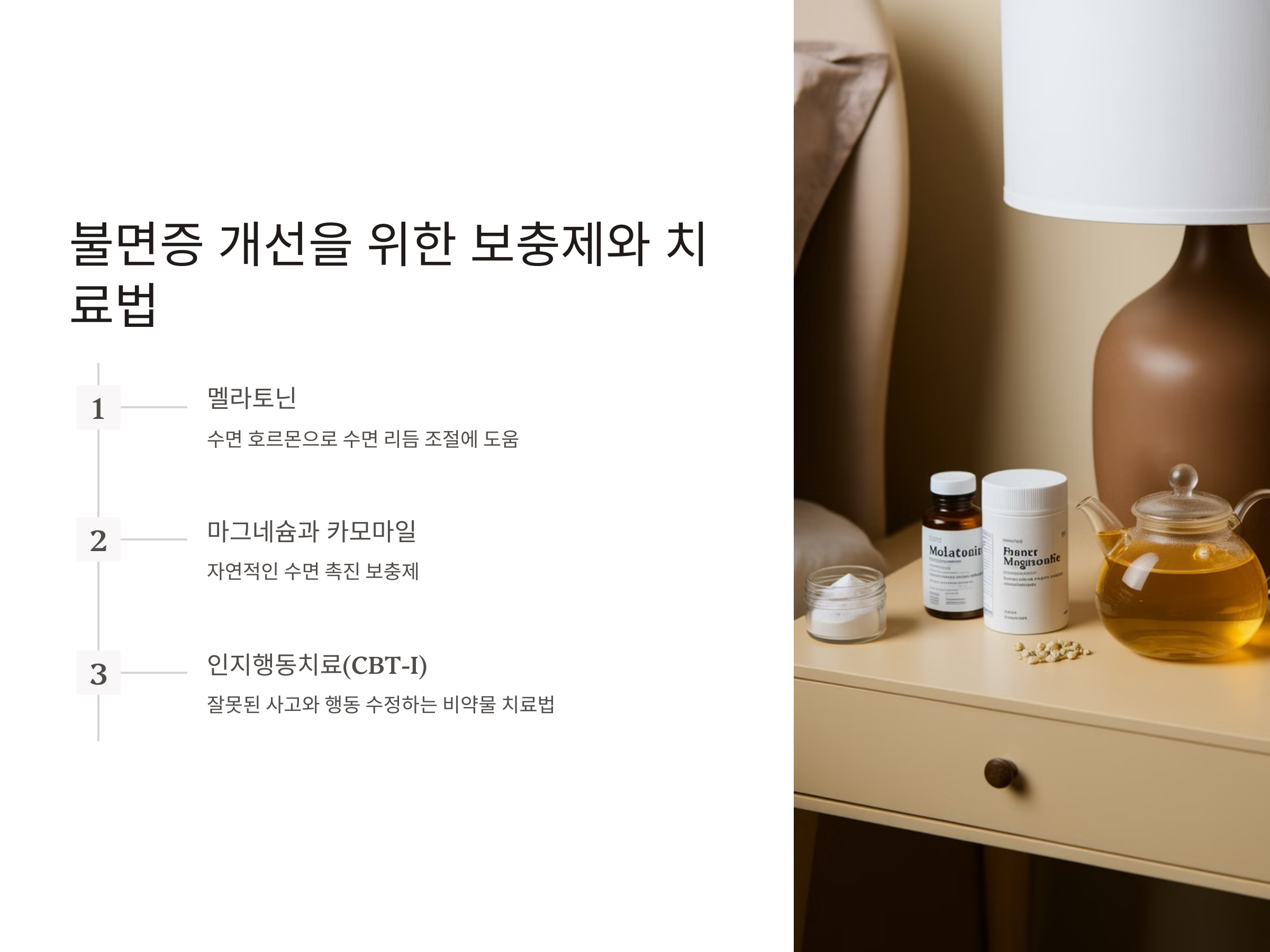 그 외에도, 인지행동치료(CBT-I)와 같은 전문가의 치료법을 고려해볼 수 있습니다. CBT-I는 수면을 방해하는 잘못된 사고방식과 행동을 수정하는 치료법으로, 약물 없이 수면을 개선할 수 있는 효과적인 방법으로 알려져 있습니다.