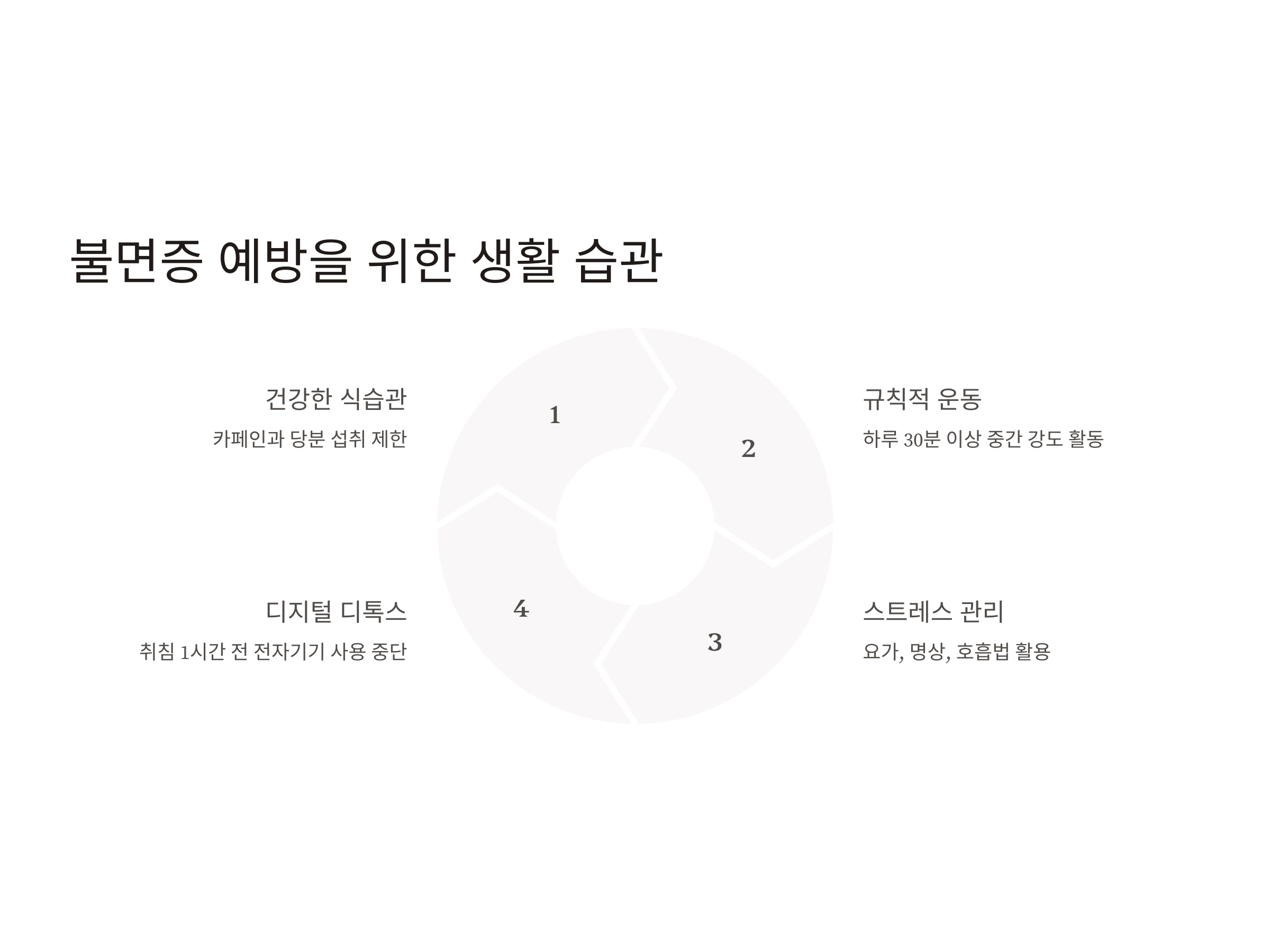 불면증을 예방하기 위해서는 건강한 생활 습관을 유지하는 것이 무엇보다 중요합니다. 스트레스를 관리하고, 식습관을 개선하며, 규칙적인 운동을 하는 등의 습관은 수면의 질을 향상시키는데 큰 도움이 됩니다. 또한, 잠자기 전에 핸드폰 사용을 자제하고, 잠자리에 드는 시간을 일정하게 유지하는 것이 좋습니다.