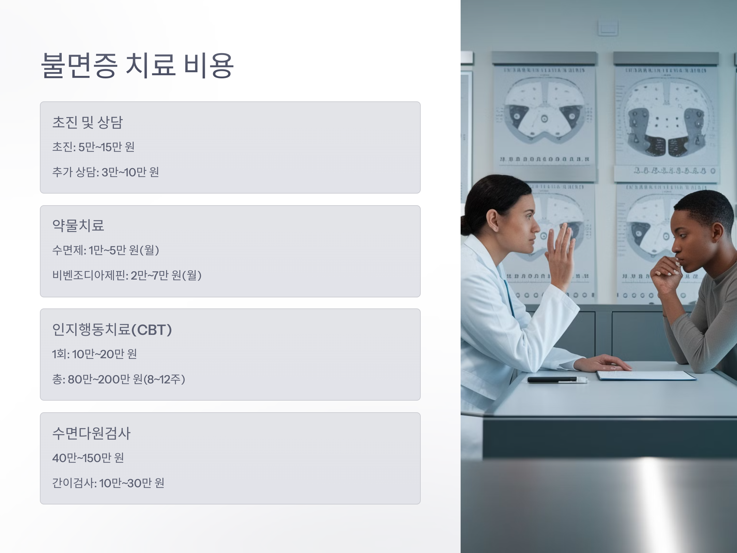 불면증 치료는 개인의 상태와 치료 방식에 따라 비용이 크게 달라집니다. 기본적인 상담부터 약물치료, 인지행동치료(CBT), 수면다원검사 등 다양한 방법이 사용되는데요. 일반적으로 예상되는 치료 비용은 다음과 같습니다.