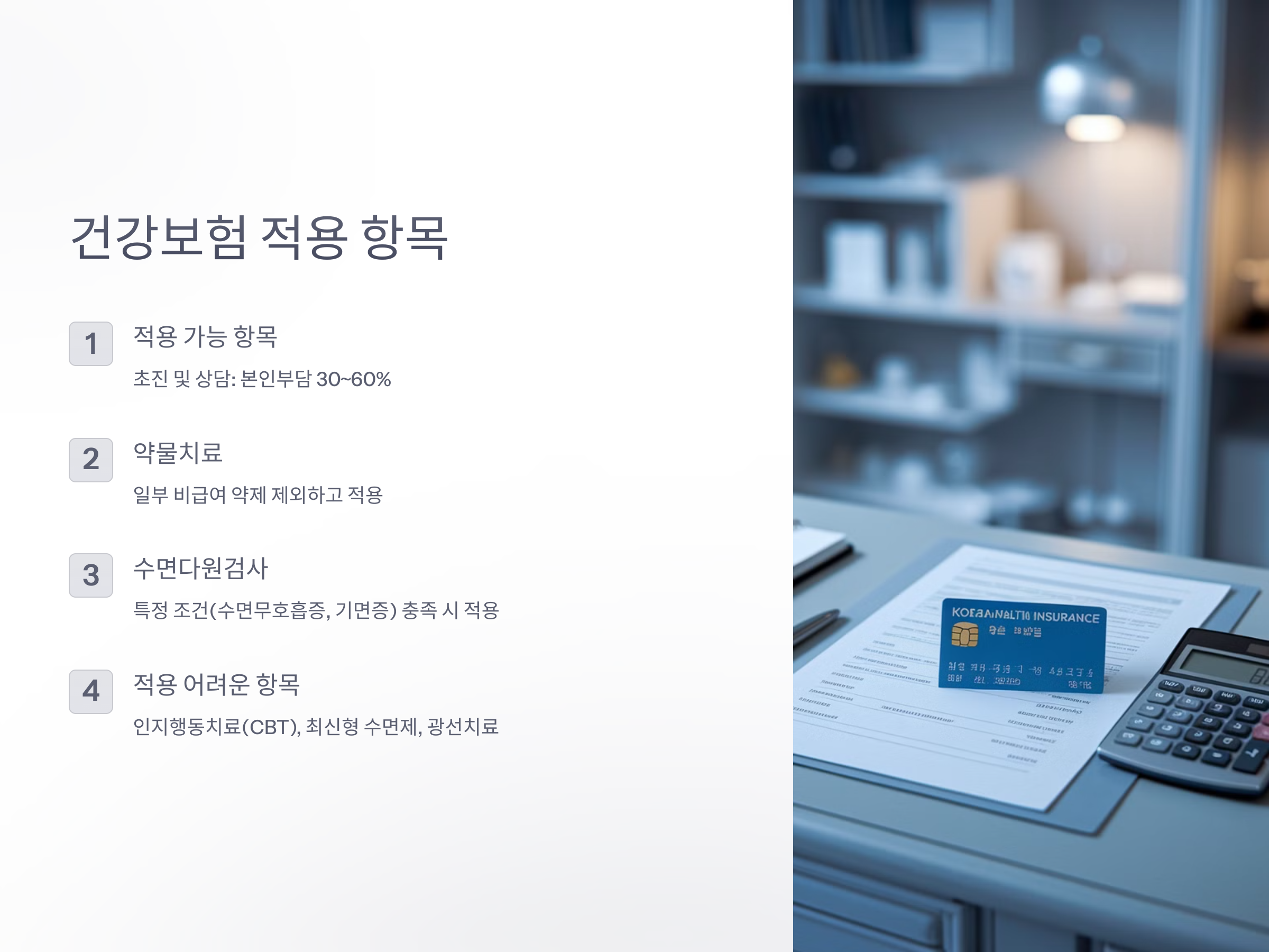 - 수면다원검사: 건강보험 적용(특정 조건 충족 시)