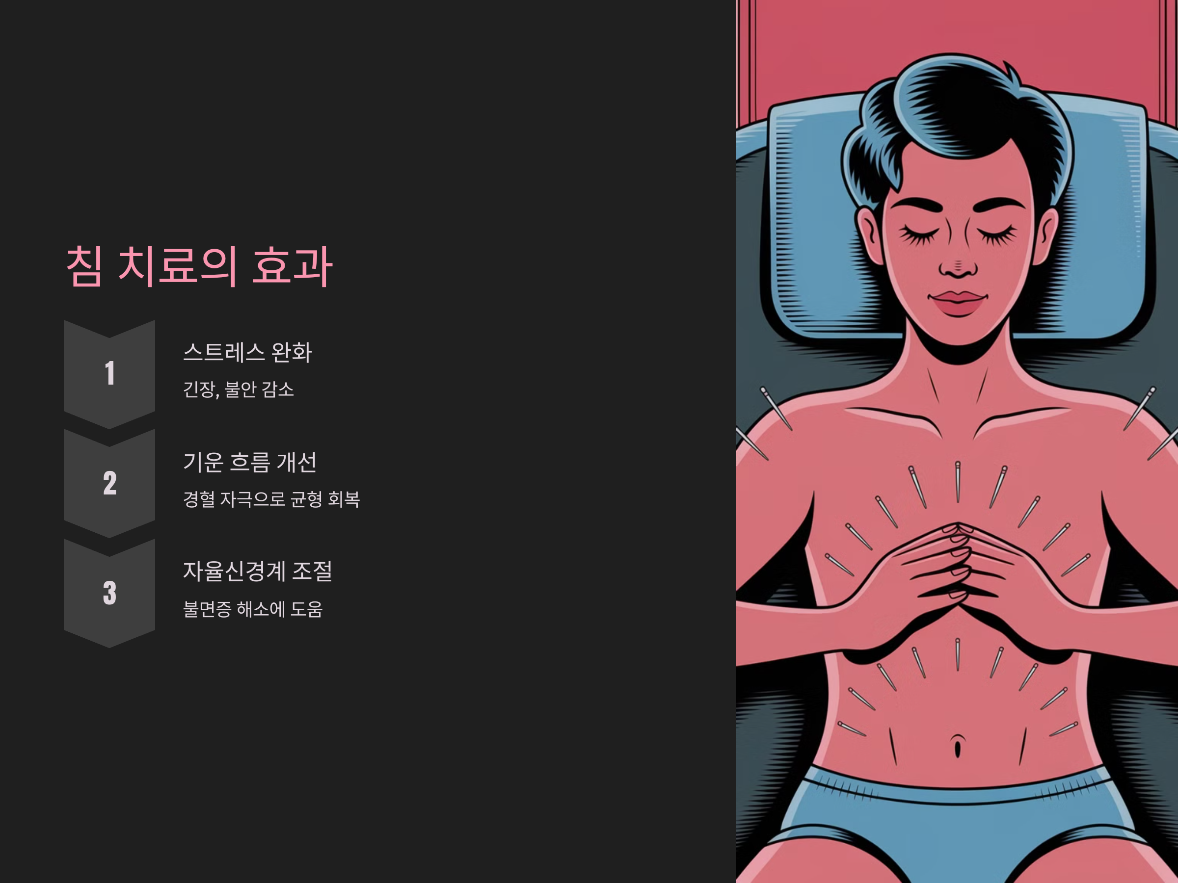 특히 침 치료는 불면증에 효과적인 방법으로 알려져 있으며, 불면증을 유발하는 스트레스, 긴장, 불안 등을 완화하는 데 도움을 줄 수 있습니다. 침 치료는 신체의 특정한 경혈에 침을 놓아 기운의 흐름을 원활하게 하고, 자율신경계의 균형을 맞춰줍니다. 이로 인해 불면증이 해소되는 효과를 볼 수 있습니다.