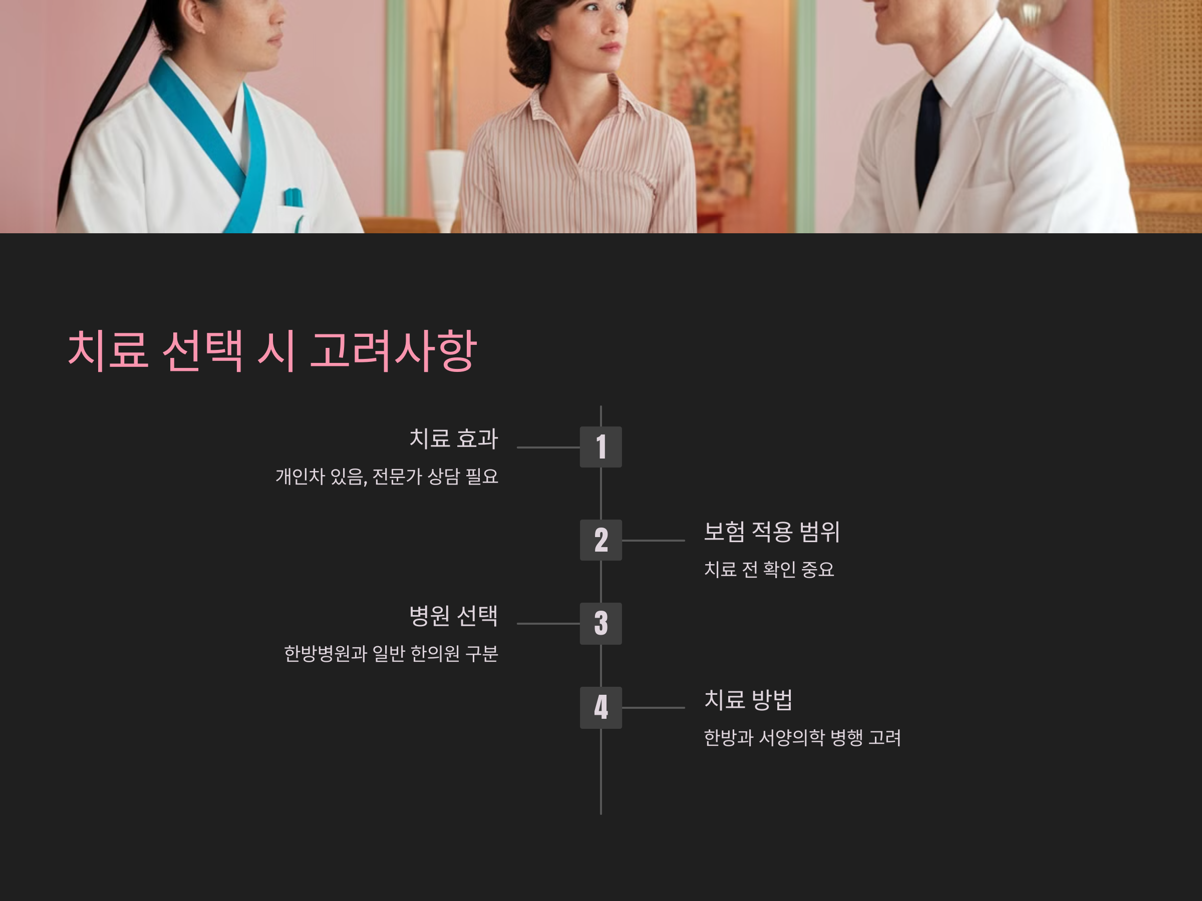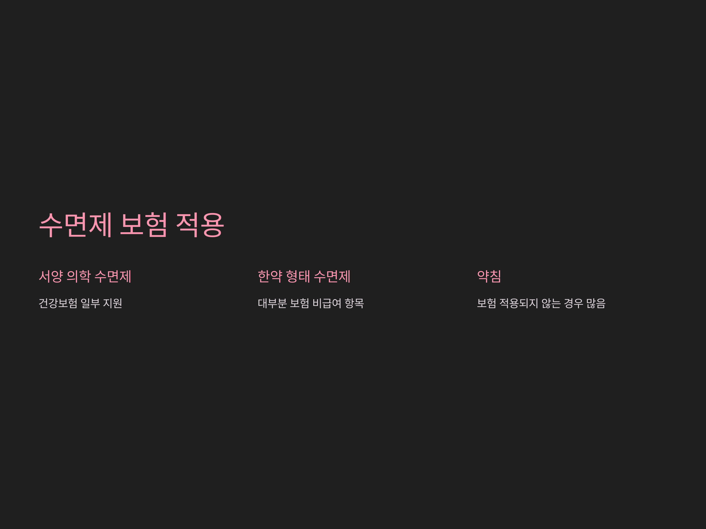 따라서 불면증을 치료하고자 할 때, 한방 치료를 받으려면 한방병원이나 보험 적용이 가능한 병원에서 치료를 받는 것이 중요하며, 수면제를 사용할 때에도 보험 적용 범위를 사전에 확인하는 것이 필요합니다.