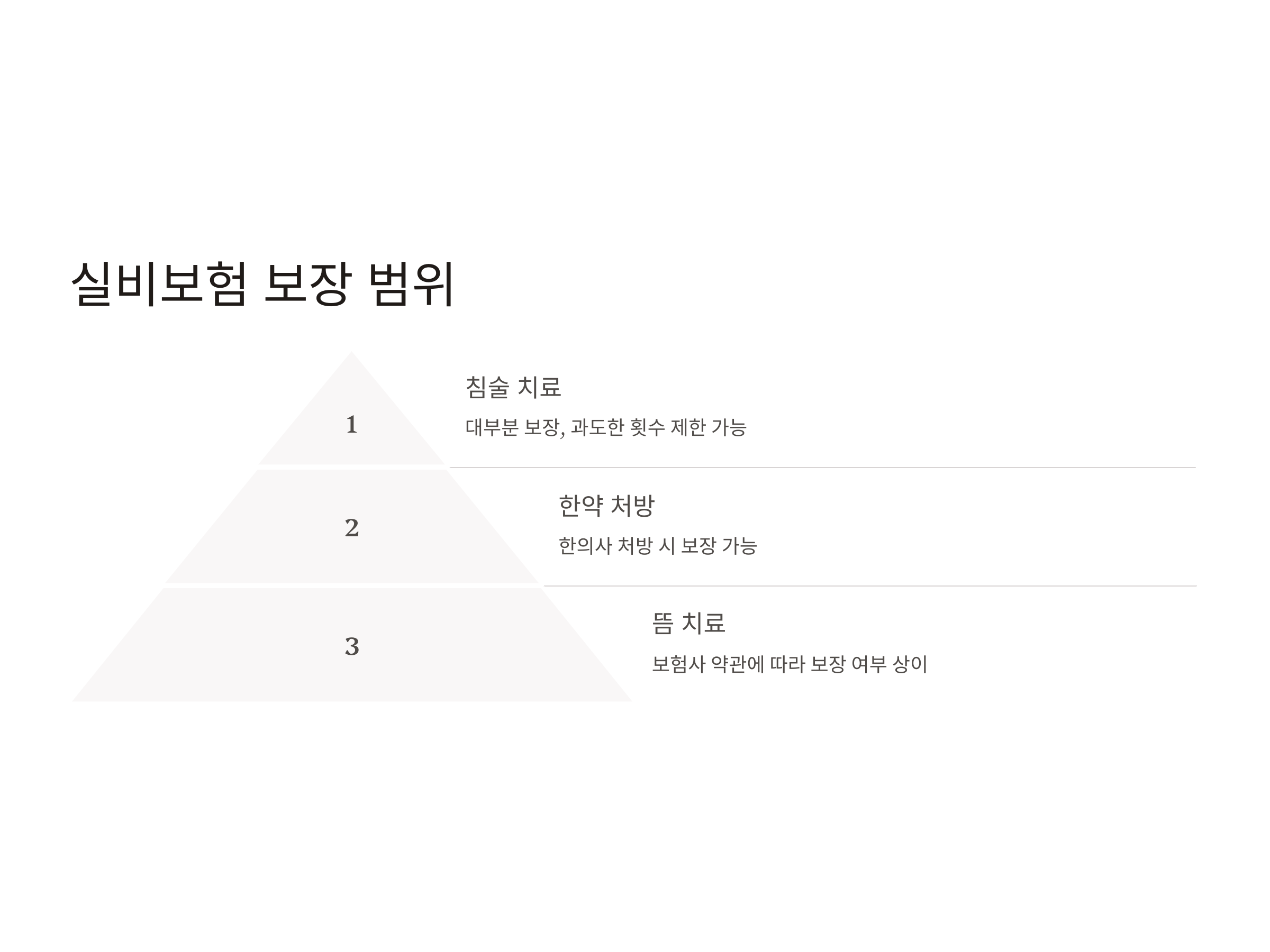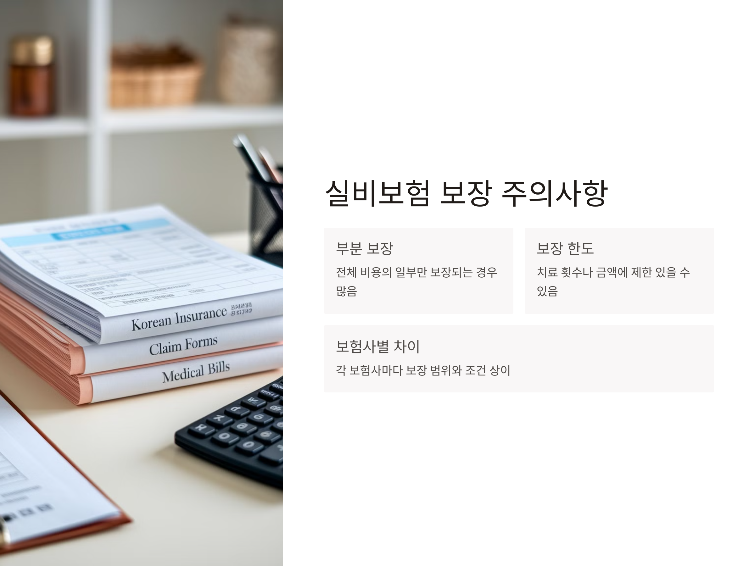 - 침술 치료: 실비보험에서는 침술을 보장하는 경우가 많습니다. 그러나 일부 치료가 필요 없거나, 과도하게 많은 치료 횟수가 요구될 경우, 보장이 제한될 수 있습니다.