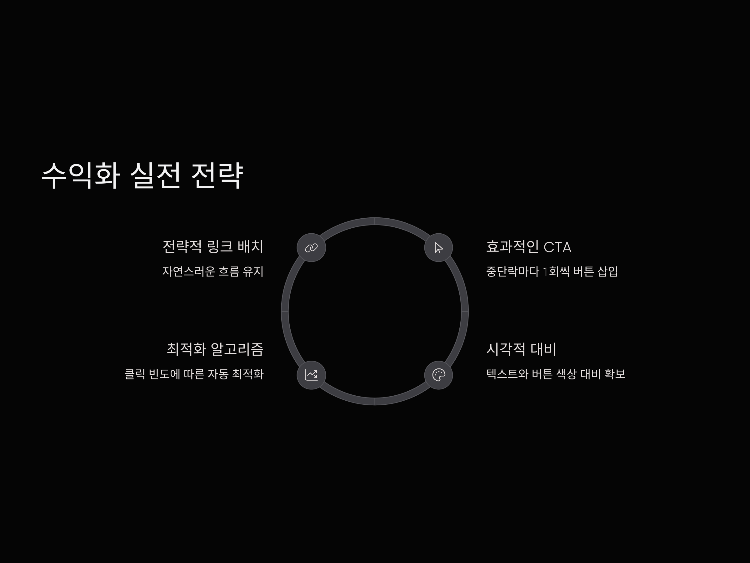 수익화의 핵심은 클릭 유도입니다. 이때 중요한 것은 무작정 많은 광고를 넣는 것이 아니라, 사용자의 흐름을 방해하지 않으면서 자연스럽게 유도하는 구조입니다. CTA(Call to Action)는 다음과 같은 방식으로 삽입하는 것이 좋습니다: