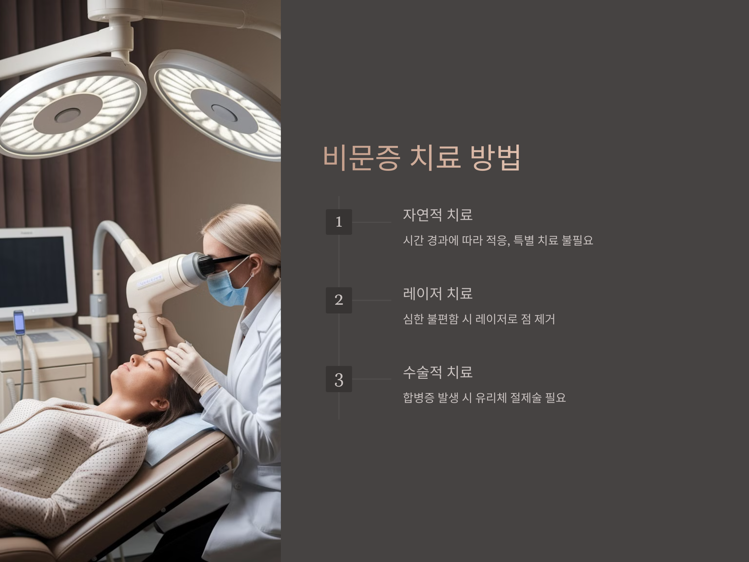 비문증은 자연스럽게 발생하는 경우가 많아 특별한 치료 없이도 시간이 지나면서 증상이 완화될 수 있습니다. 하지만 심각한 상태가 되면 레이저 치료나 수술이 필요할 수 있습니다.