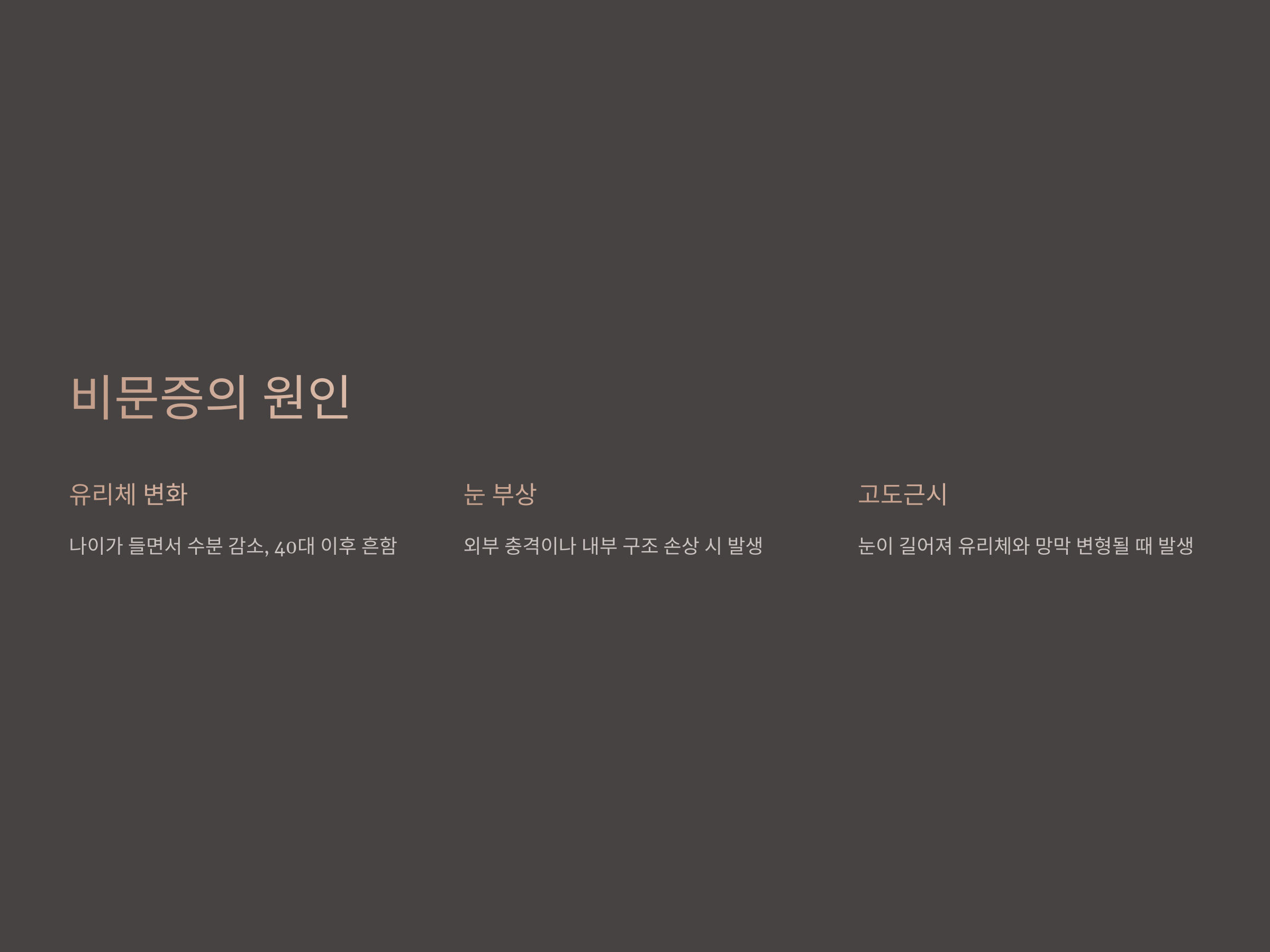 비문증의 원인에는 여러 가지가 있지만, 가장 대표적인 원인으로는 유리체의 변화가 있습니다. 유리체는 나이가 들면서 점차적으로 수분이 빠져나가고, 그로 인해 부피가 줄어듭니다. 이때 유리체 내에 있는 단백질 덩어리들이 모여서 눈 앞에서 떠다니는 점처럼 보이게 되는 것입니다. 이는 주로 40대 이후에 나타나며, 대부분은 나이가 들어감에 따라 자연스러운 현상입니다.