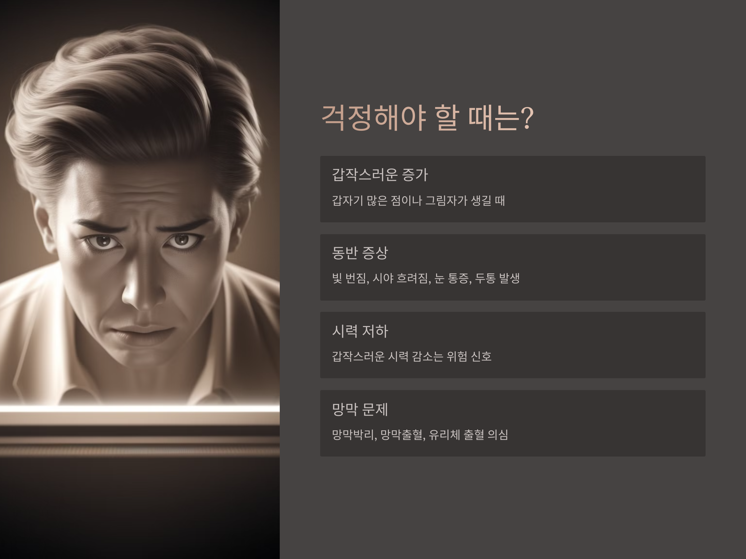 이러한 증상은 망막박리, 망막출혈, 또는 유리체 출혈 등의 심각한 문제를 암시할 수 있습니다. 이러한 상태에서는 빠른 치료가 필요할 수 있기 때문에, 즉시 안과를 방문해 검사를 받는 것이 중요합니다.