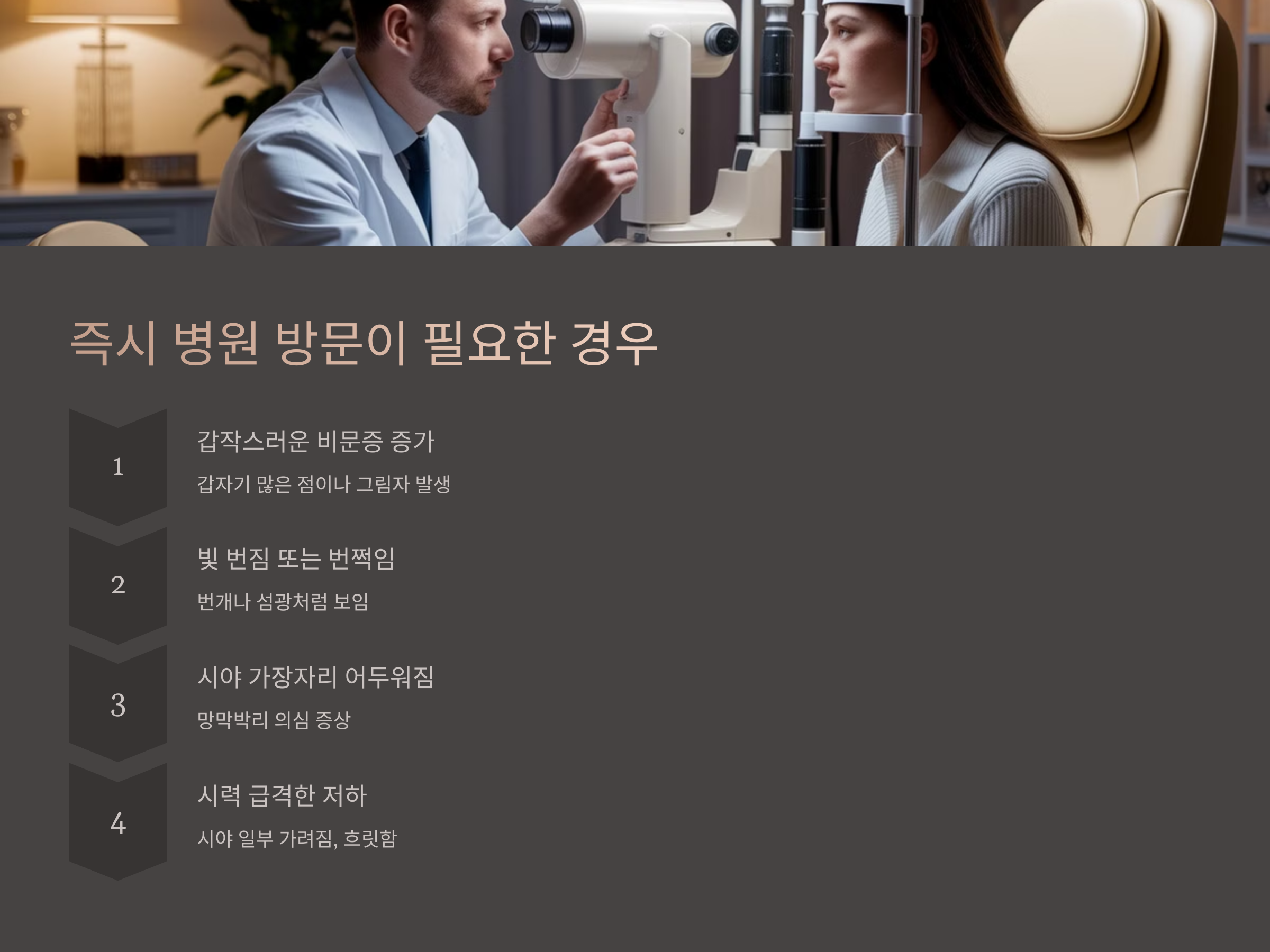 갑작스럽게 비문증이 심해지거나 시력에 영향을 미친다면 즉시 안과를 방문하여 검사를 받아야 합니다. 특히 시력 변화, 통증 등이 동반되면 빠른 대처가 필요합니다.