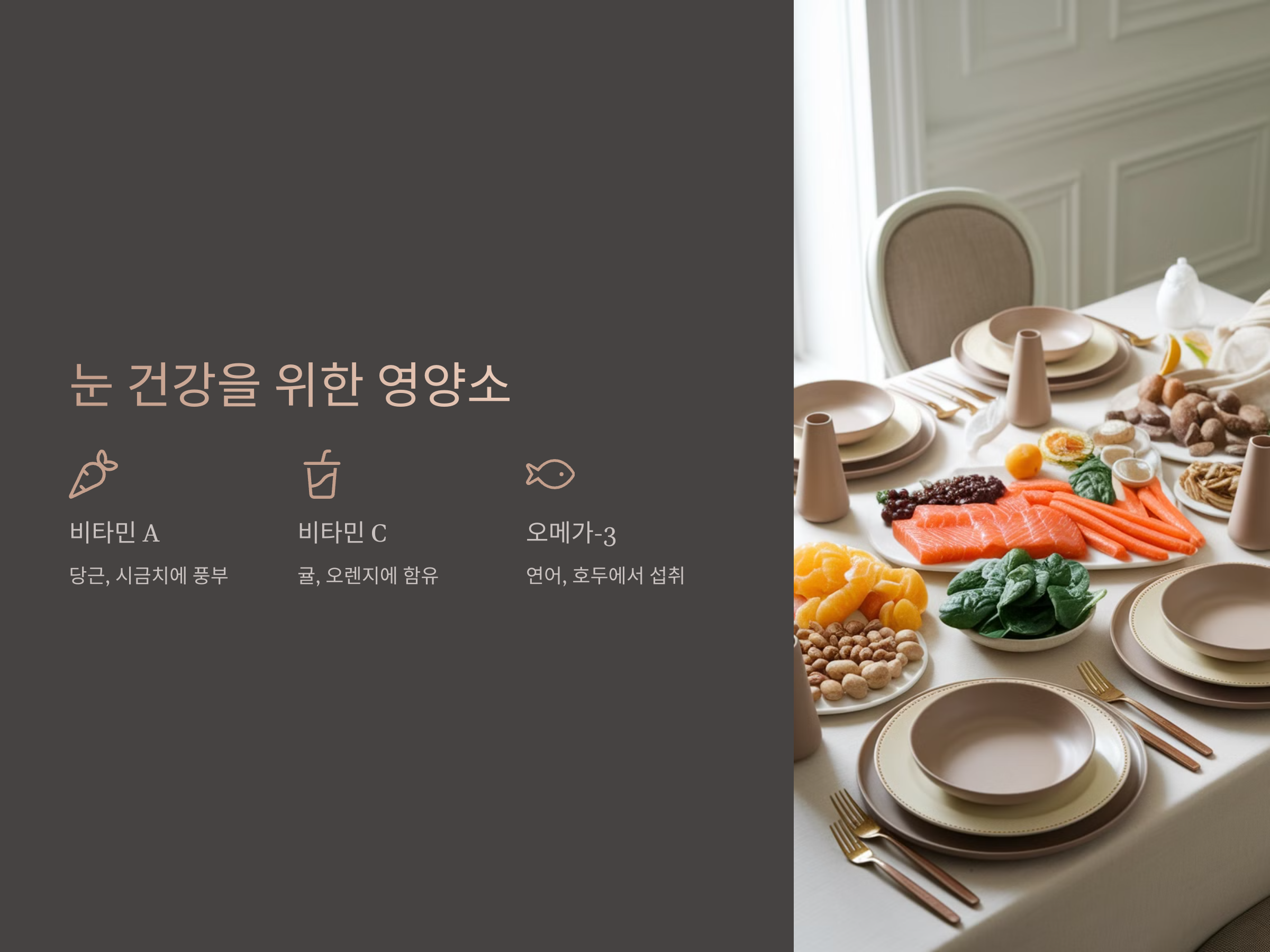 눈 건강에 좋은 비타민 A, C, E와 같은 항산화 물질이 풍부한 음식을 섭취하는 것이 중요합니다. 당근, 시금치, 브로콜리와 같은 채소와 과일을 많이 먹는 것이 좋습니다. 또한, 오메가-3 지방산이 풍부한 연어나 호두 등의 음식을 섭취하는 것도 눈 건강에 좋습니다.