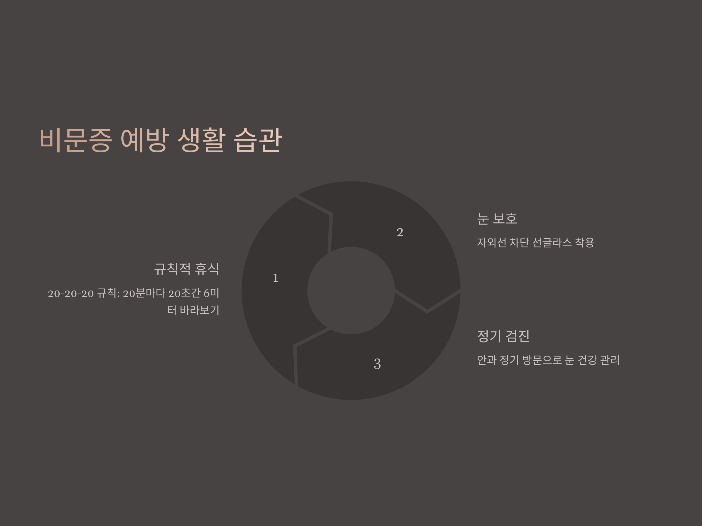 비문증을 예방하는 명확한 방법은 없지만, 눈 건강을 유지하기 위한 몇 가지 생활 습관을 실천하는 것이 중요합니다. 눈에 좋은 영양소를 섭취하고, 과도한 눈의 피로를 방지하는 것이 도움이 될 수 있습니다.