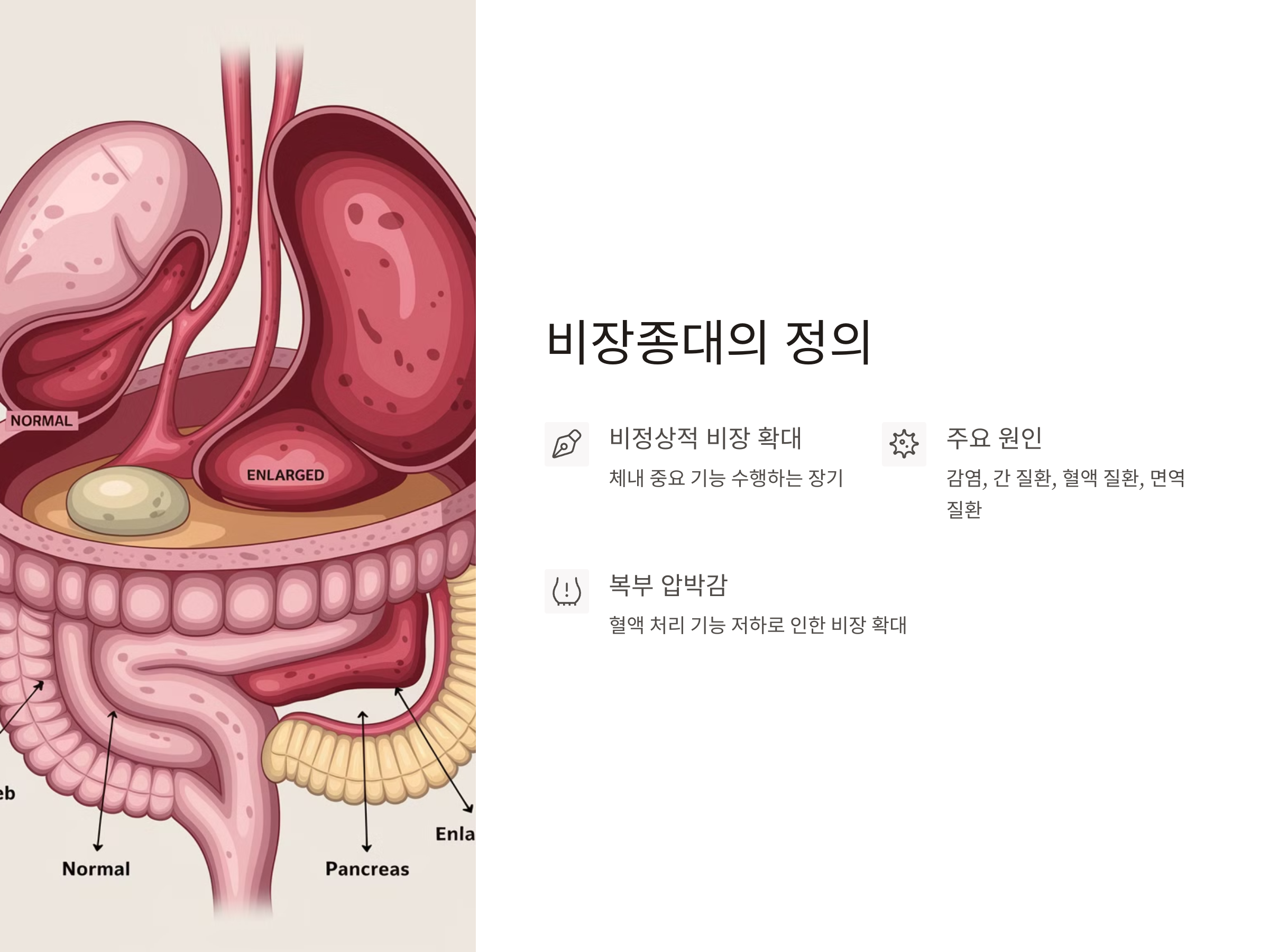 비장종대는 비장이 비정상적으로 커지는 질환을 의미합니다. 보통 비장은 체내에서 중요한 기능을 수행하지만, 여러 가지 질환에 의해 비장이 커질 수 있습니다. 비장종대의 원인으로는 감염, 간 질환, 혈액 질환, 면역 질환 등이 있습니다. 이러한 상태에서는 비장이 혈액을 제대로 처리하지 못하고 커지게 되어, 복부에 압박감을 유발하게 됩니다.