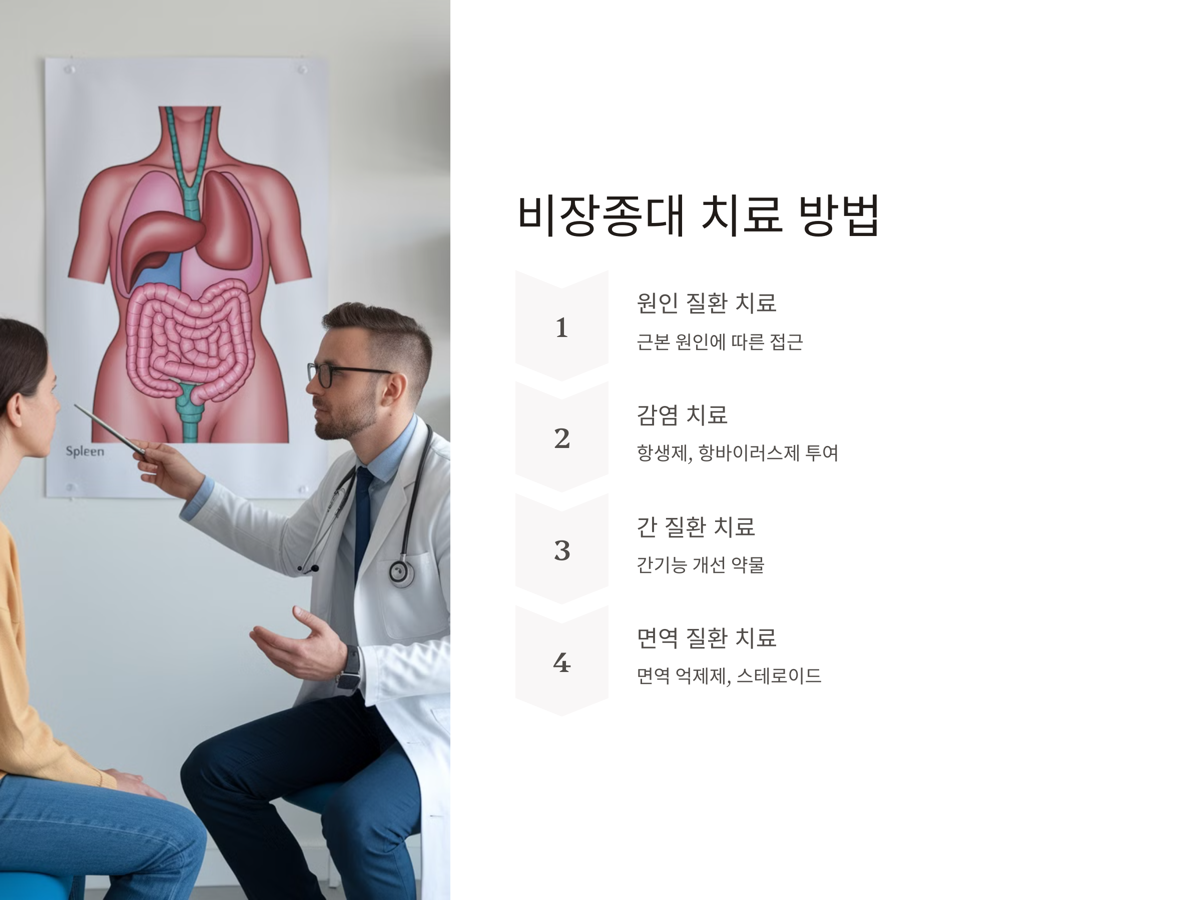 비장종대의 치료는 원인에 따라 달라지며, 감염에 의한 경우 항생제나 항바이러스 치료, 간 질환에 의한 경우 간 기능 개선을 위한 약물 치료가 필요합니다.