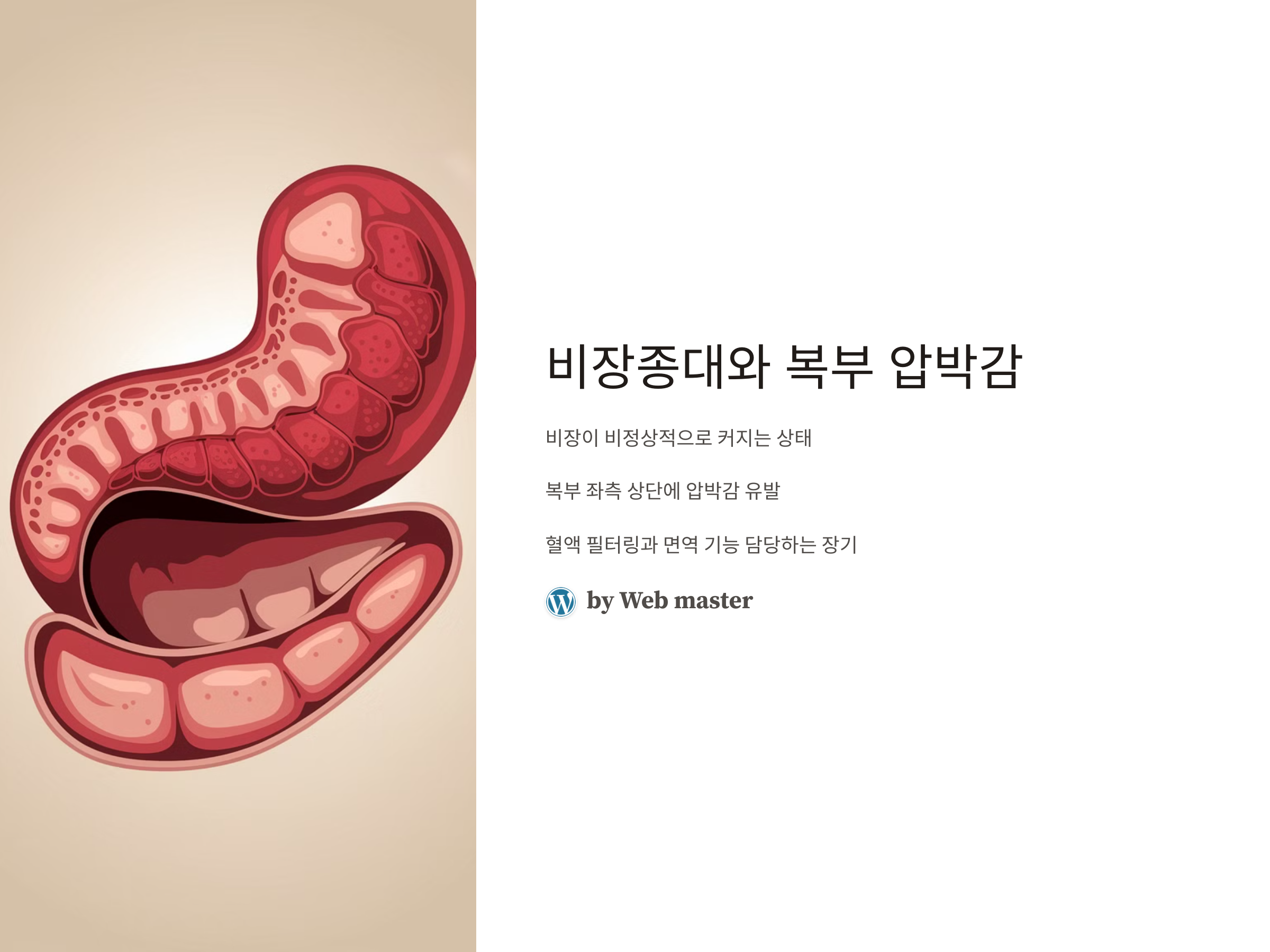 비장종대(splenomegaly)는 비장이 비정상적으로 커져서 발생하는 상태로, 그로 인해 복부의 압박감과 불편함을 유발할 수 있습니다. 비장은 체내에서 중요한 역할을 하는 장기 중 하나로, 주로 혈액을 필터링하고 면역 기능을 지원하는 역할을 합니다. 비장이 커지면 복부의 좌측 상단에 압박감을 느끼게 되며, 이는 불편한 증상으로 나타날 수 있습니다. 이 글에서는 비장종대가 복부 압박감을 일으키는 원인과 증상, 그리고 치료 방법에 대해 자세히 알아보겠습니다.