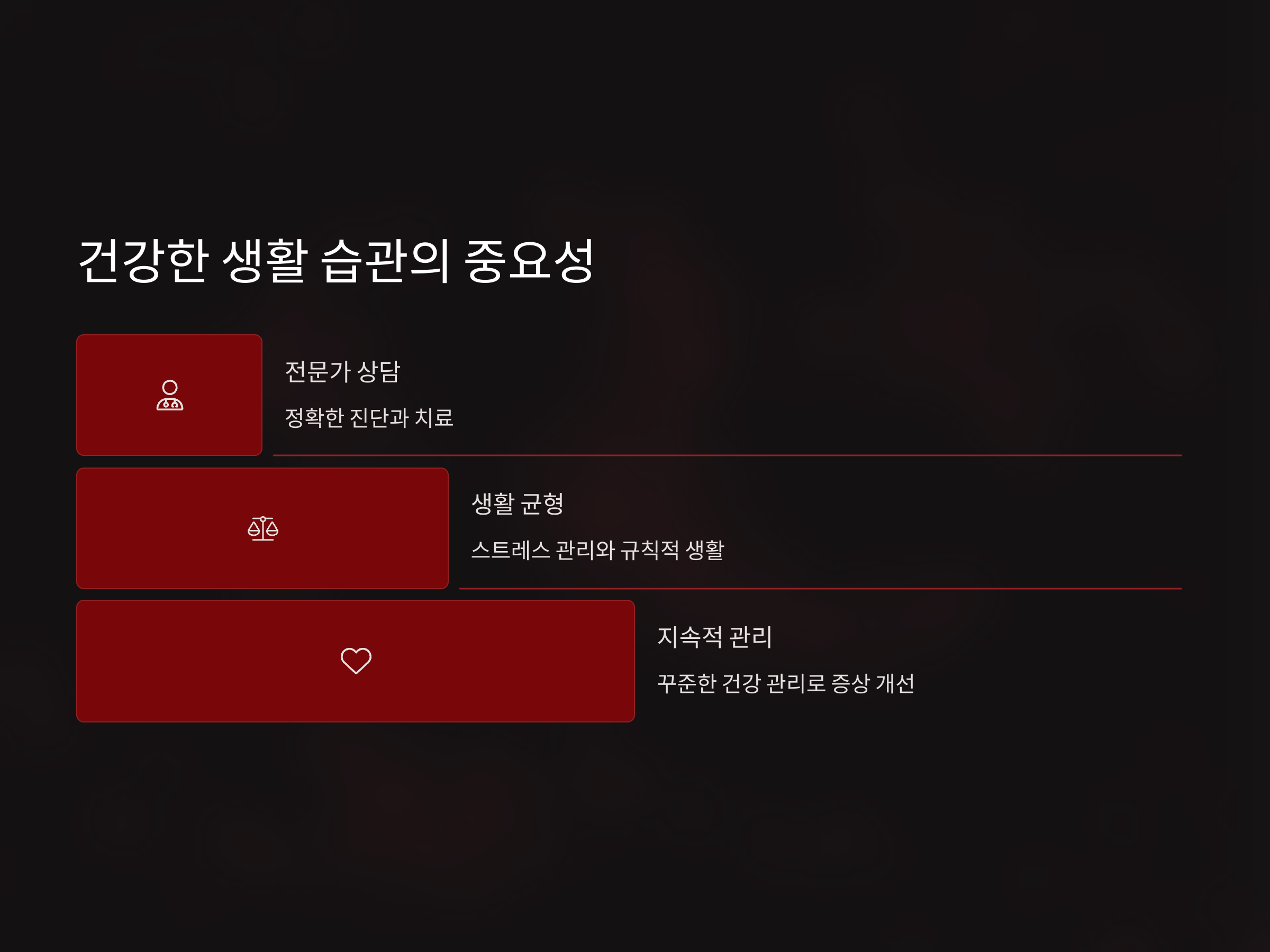 셋째, 적절한 운동을 통해 혈액 순환을 원활하게 하고, 신체 기능을 회복시킬 수 있습니다. 운동은 피로감을 줄이고, 전반적인 건강 상태를 개선하는 데 큰 도움이 될 수 있습니다.