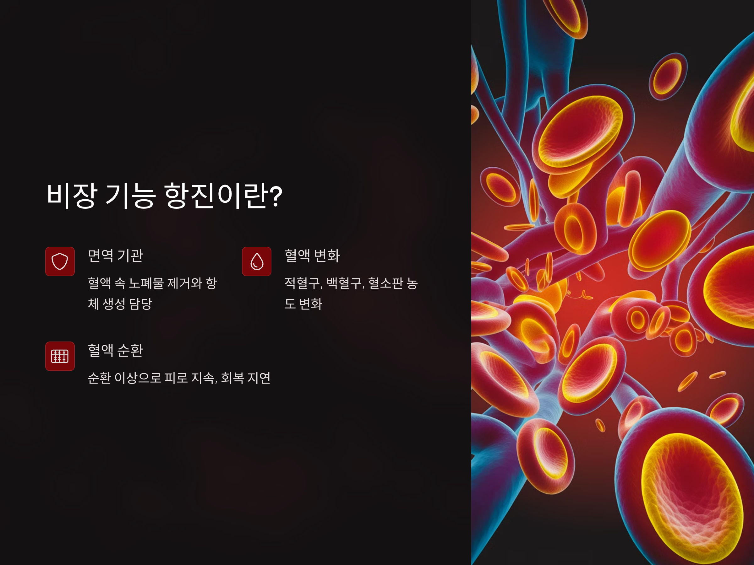이 상태에서는 혈액 내의 적혈구, 백혈구, 혈소판 등의 농도가 변화할 수 있습니다. 이로 인해 멍이 잘 들거나, 피로감을 자주 느끼는 등의 증상이 발생할 수 있습니다. 또한 비장이 과도하게 활성화되면 혈액 순환에 이상이 생겨 피로가 지속되거나 회복이 더디게 될 수 있습니다.