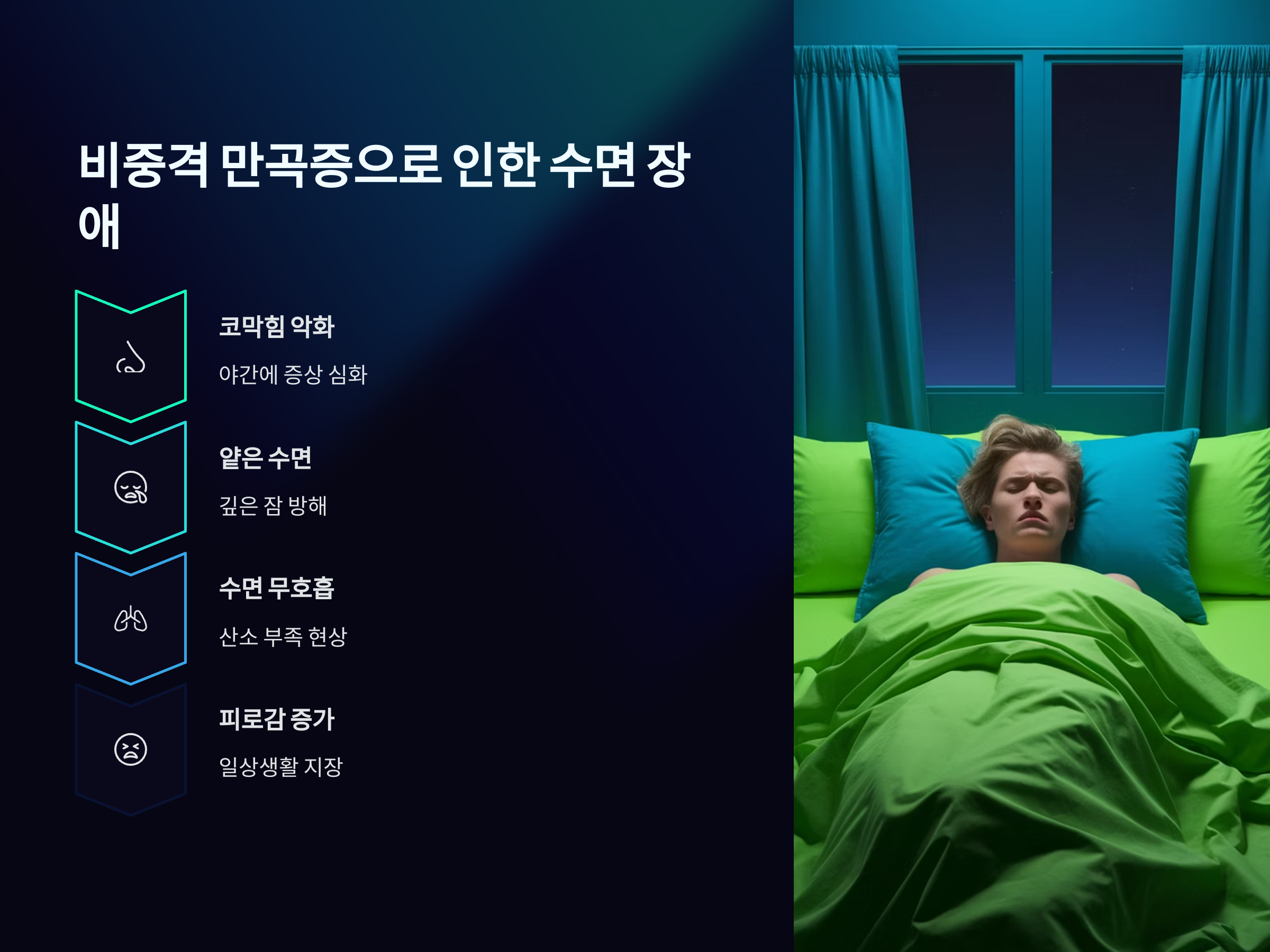 비중격 만곡증은 코막힘을 유발하여, 수면 중 호흡이 어려워지거나 얕은 잠을 자게 만듭니다. 이로 인해 수면 중 산소가 부족해지고, 깊은 잠에 들어가지 못하는 상황이 발생할 수 있습니다. 수면 중 코막힘은 주로 야간에 심해지며, 이는 수면 무호흡증을 유발할 수 있습니다. 수면 무호흡증은 자주 숨을 멈추는 현상으로, 수면의 질을 크게 저하시킬 뿐만 아니라 건강에도 심각한 영향을 미칠 수 있습니다.
