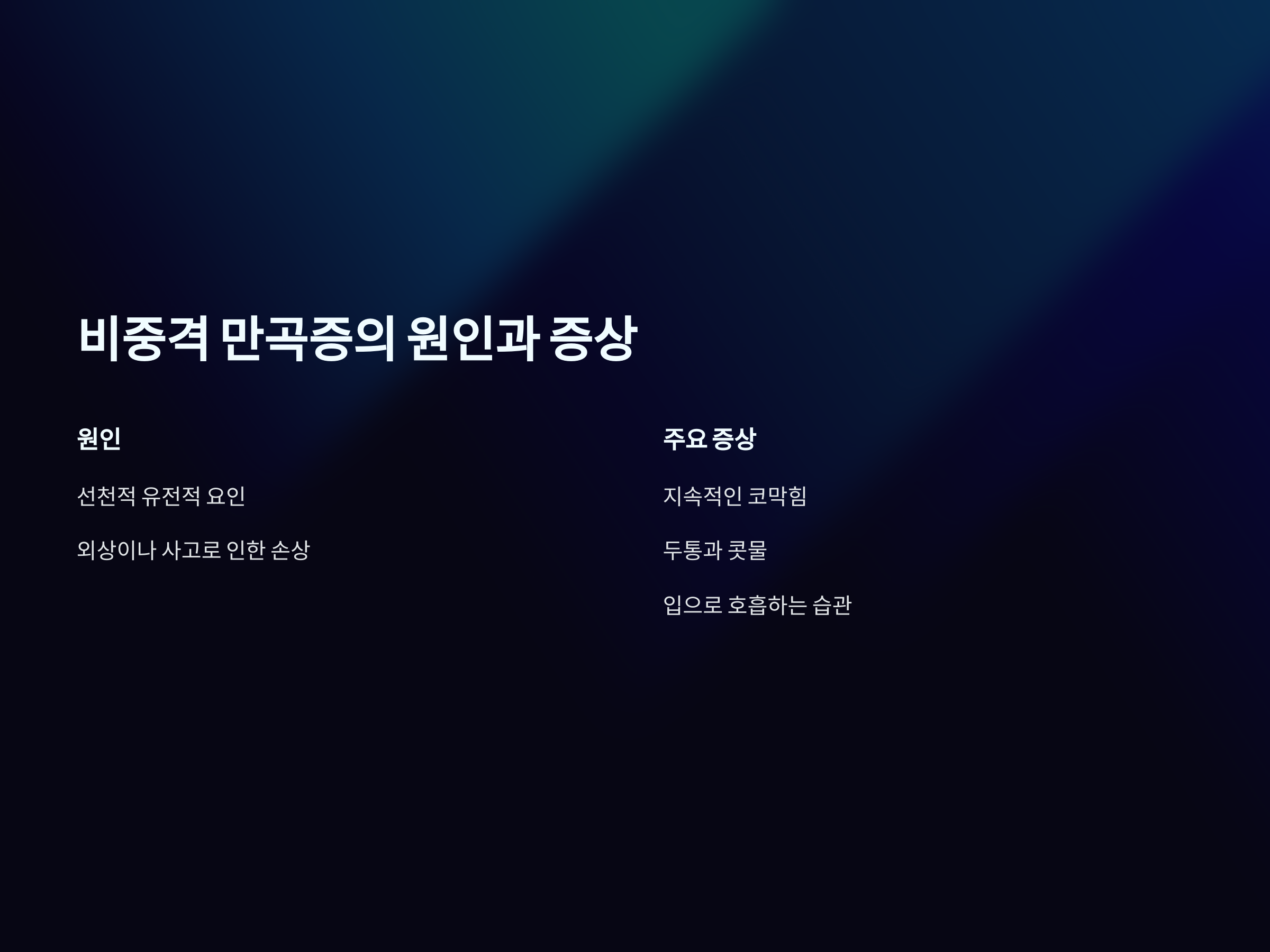 비중격 만곡증의 주요 원인은 선천적인 유전적 요인과 후천적인 외부 요인들로 나눌 수 있습니다. 선천적인 경우, 사람의 비중격이 태어날 때부터 비정상적으로 휘어져 있는 경우가 많습니다. 또한, 외상이나 사고로 인해 비중격이 휘어지는 경우도 있습니다.