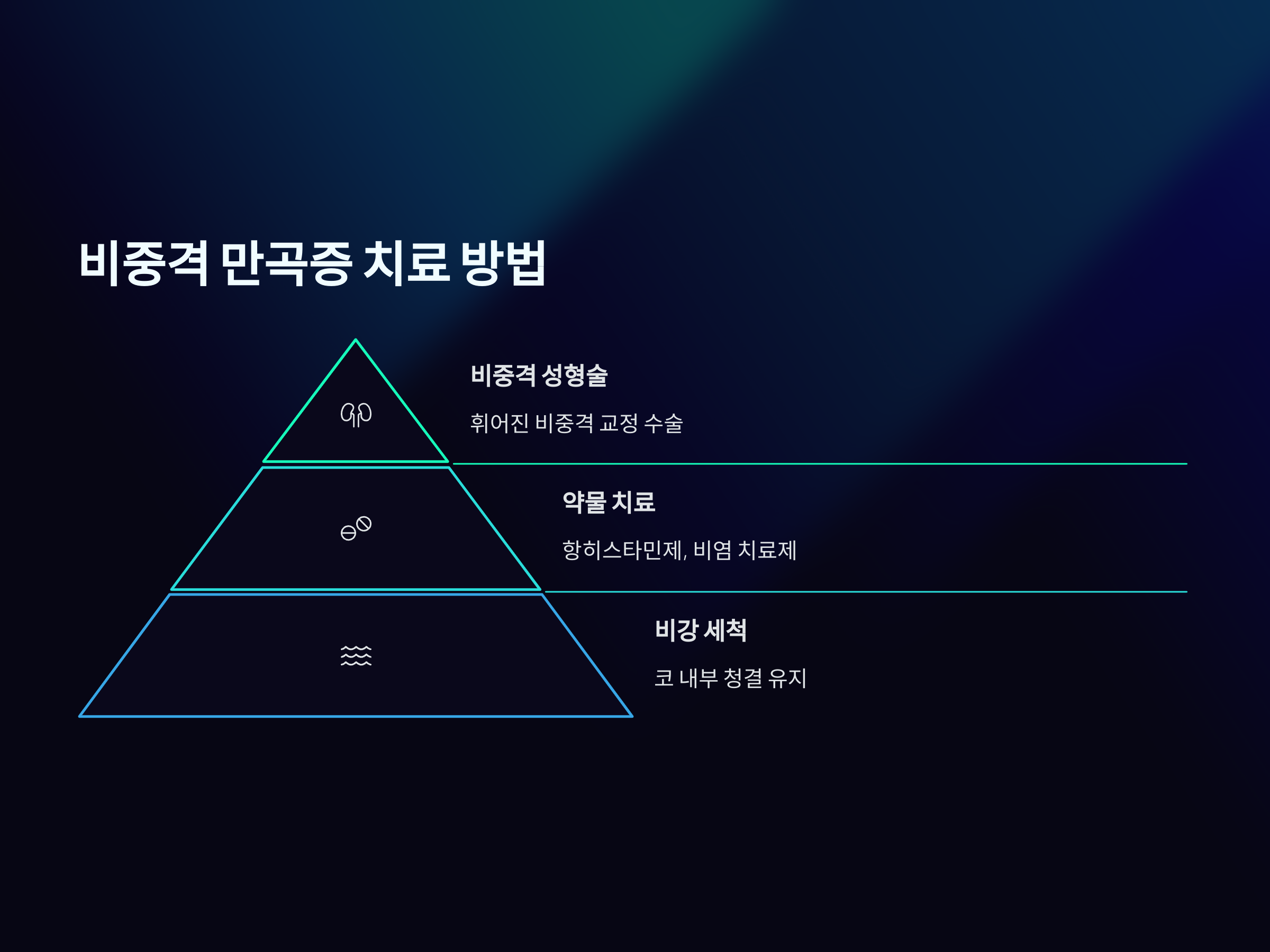 비중격 만곡증의 치료 방법은 증상의 정도와 개인의 상태에 따라 다를 수 있습니다. 기본적으로, 초기 단계에서 증상이 경미하다면 약물 치료와 비강 세척 등을 통해 증상을 완화할 수 있습니다. 비염이나 알레르기 등의 동반 질환이 있는 경우, 항히스타민제나 비염 치료제를 처방받을 수 있습니다.