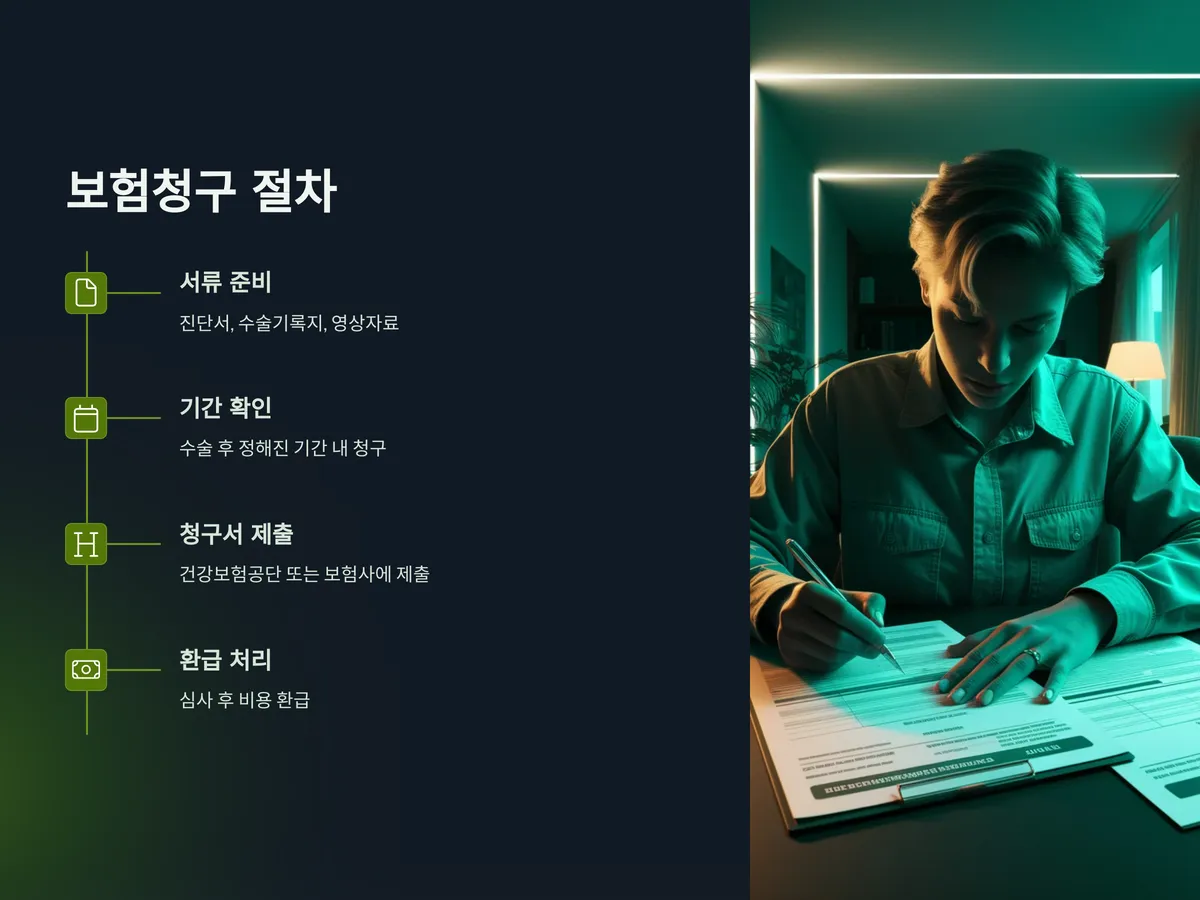 보험청구를 위한 서류는 일반적으로 진단서, 수술 기록지, 진료비 세부 내역서, 영상자료 등이 포함됩니다. 병원에 따라 준비 서류가 조금씩 다르므로, 수술 전 상담 시 보험청구에 필요한 서류를 미리 체크해두는 것이 좋습니다.