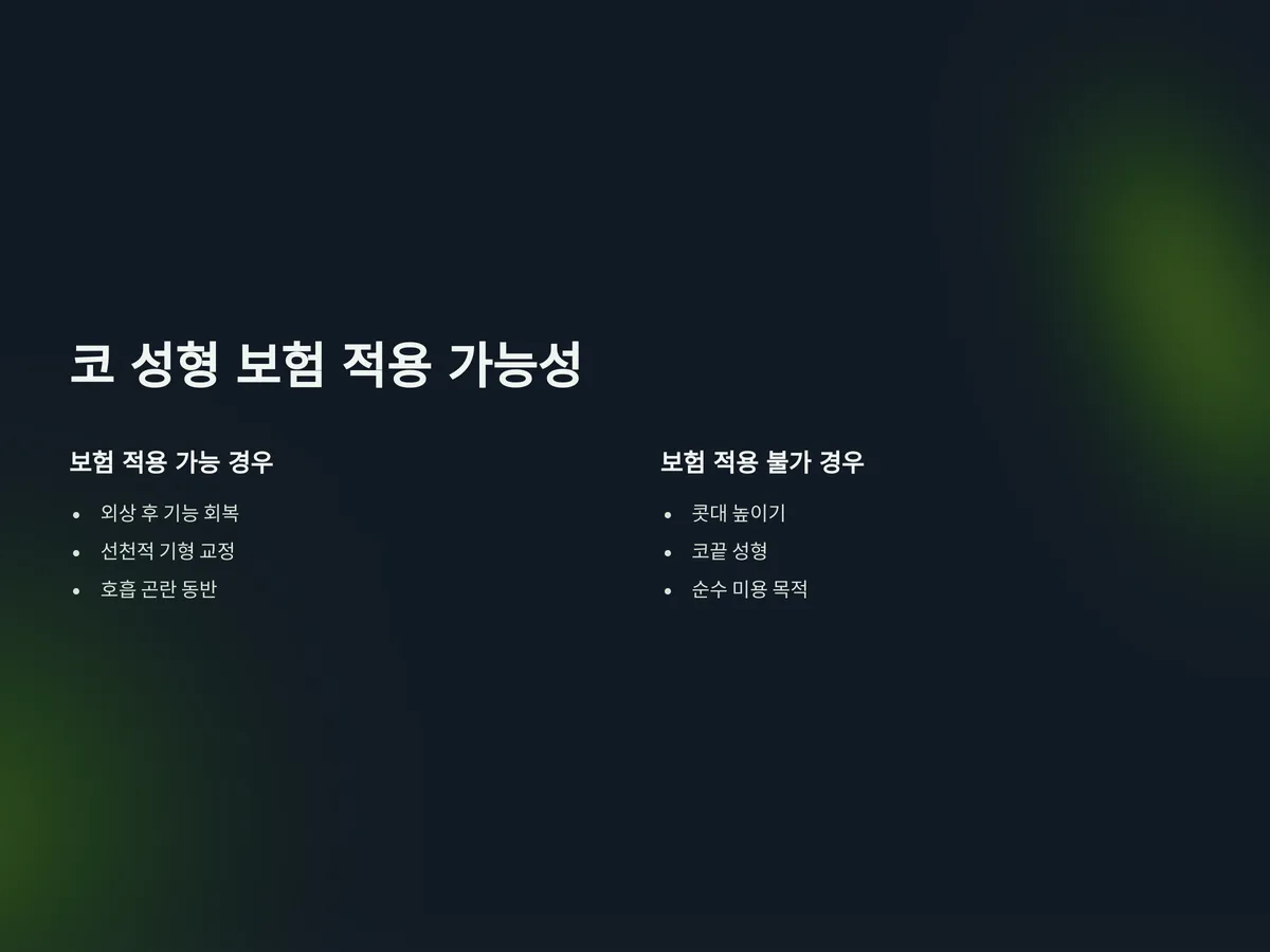 미용 목적의 코 성형은 원칙적으로 건강보험의 적용을 받을 수 없습니다. 하지만 예외적인 상황이 존재합니다. 코 성형이 기능적 문제를 동반하는 경우, 즉 외상이나 선천적 기형으로 인한 기능적 문제를 함께 교정하는 성형은 보험 적용이 가능합니다.