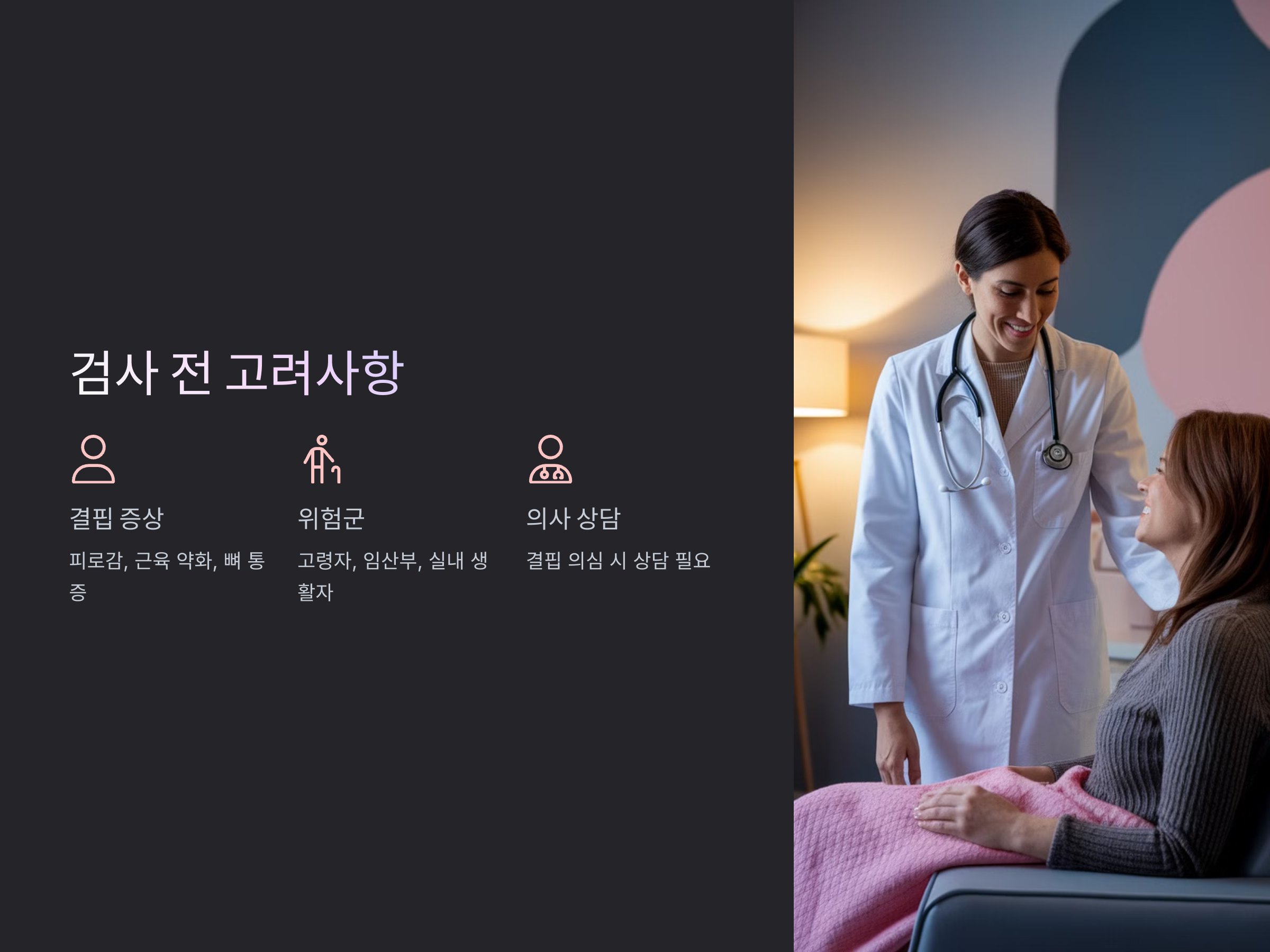 - 위험군: 고령자, 임산부, 햇볕을 충분히 받지 못하는 사람, 비타민 D가 부족한 식사를 하는 사람 등은 검사를 고려할 수 있습니다.
