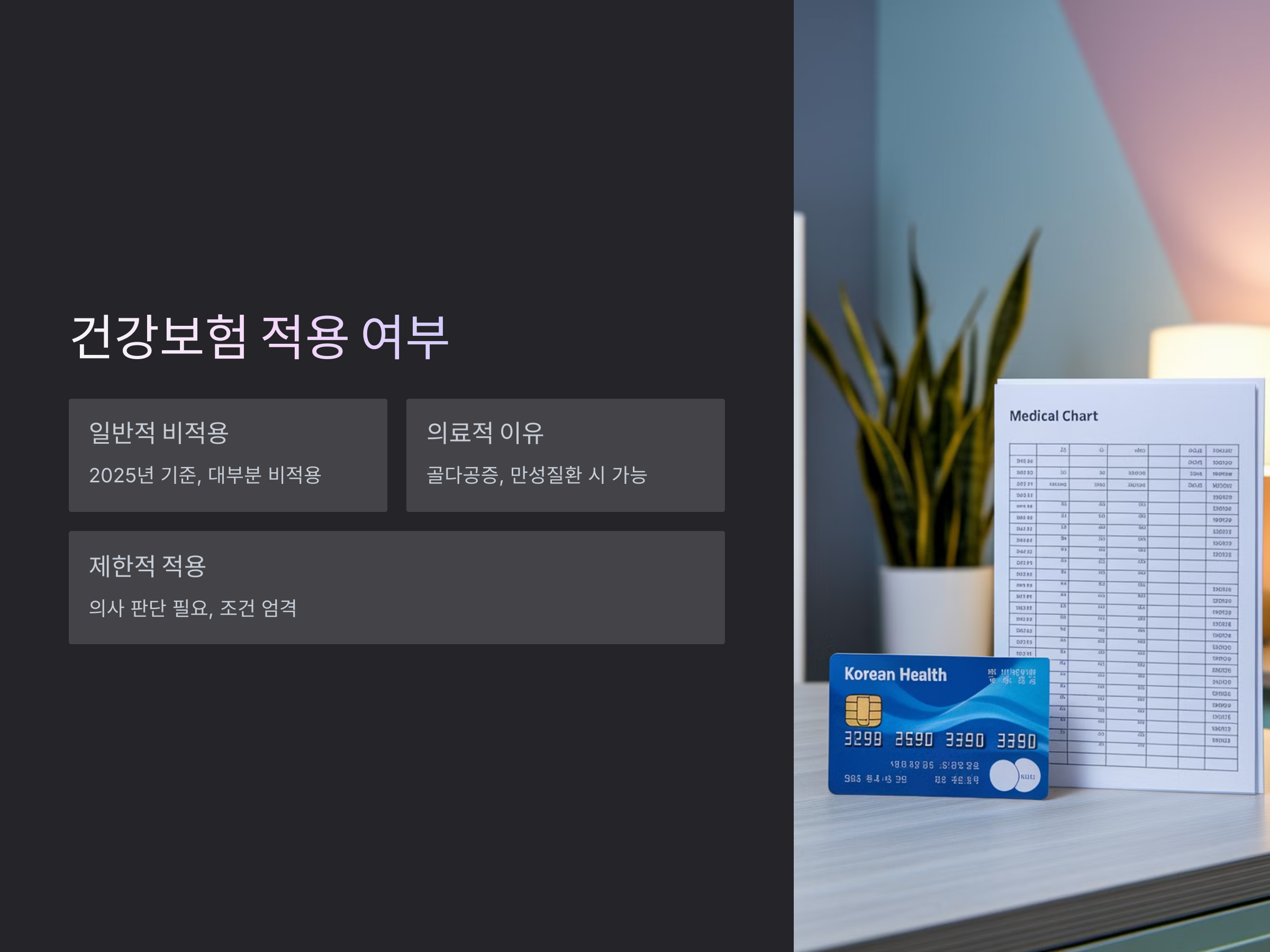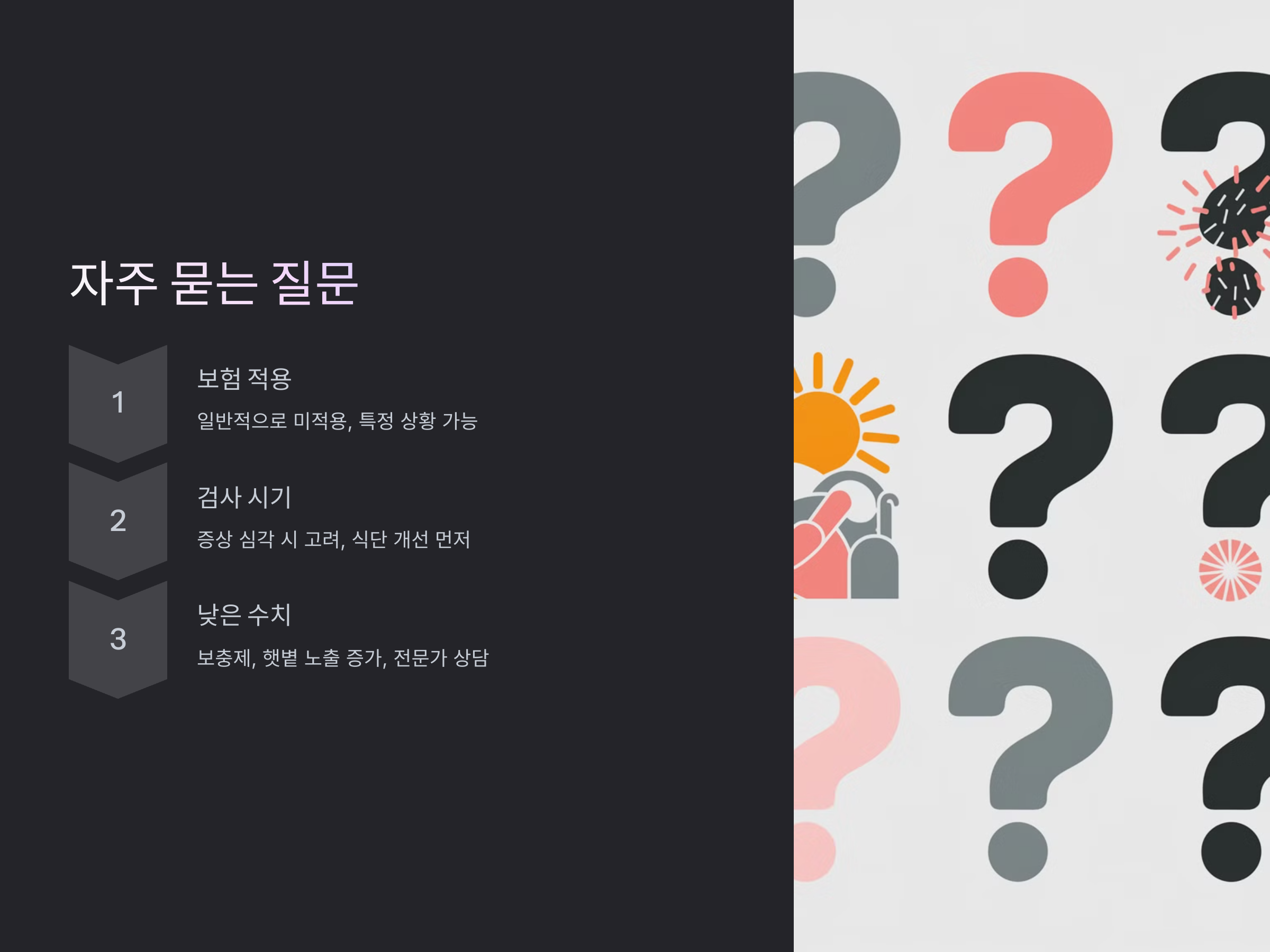 다만, 특정 질병이나 증상이 있을 경우(예: 비타민 D 결핍으로 의심되는 뼈 통증, 근육통, 골다공증 고위험군 등)에는 일부 보험 적용이 가능할 수 있습니다. 예를 들어, 골밀도 검사와 함께 비타민 D 수치를 확인할 때는 보험이 적용되는 경우가 많습니다.