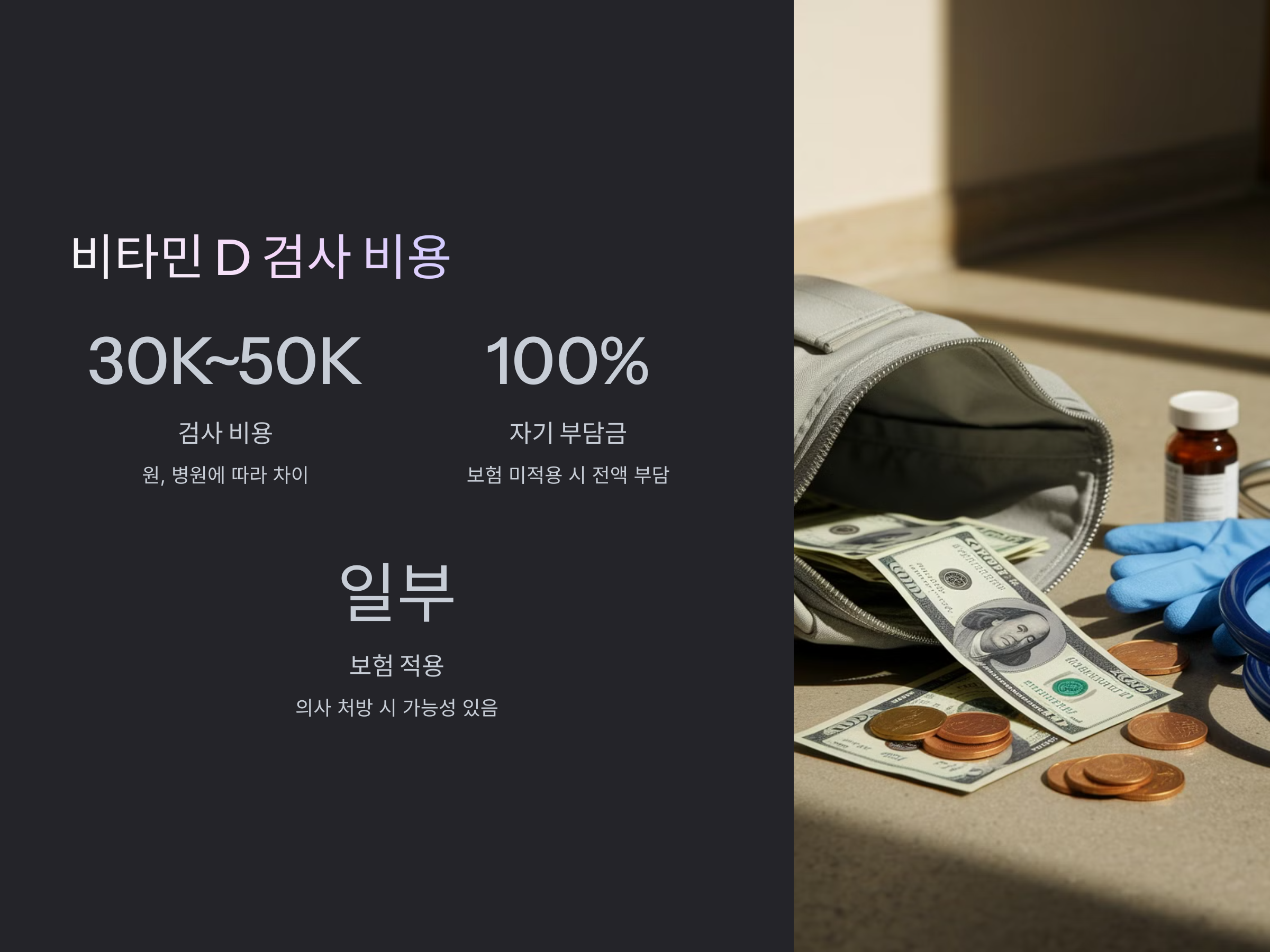 - 보험 적용 여부: 만약 의사의 처방에 따라 비타민 D 검사를 받는 경우, 그 검사에 따른 비용 일부가 보험으로 커버될 수 있습니다. 하지만 이는 매우 제한적인 경우입니다.