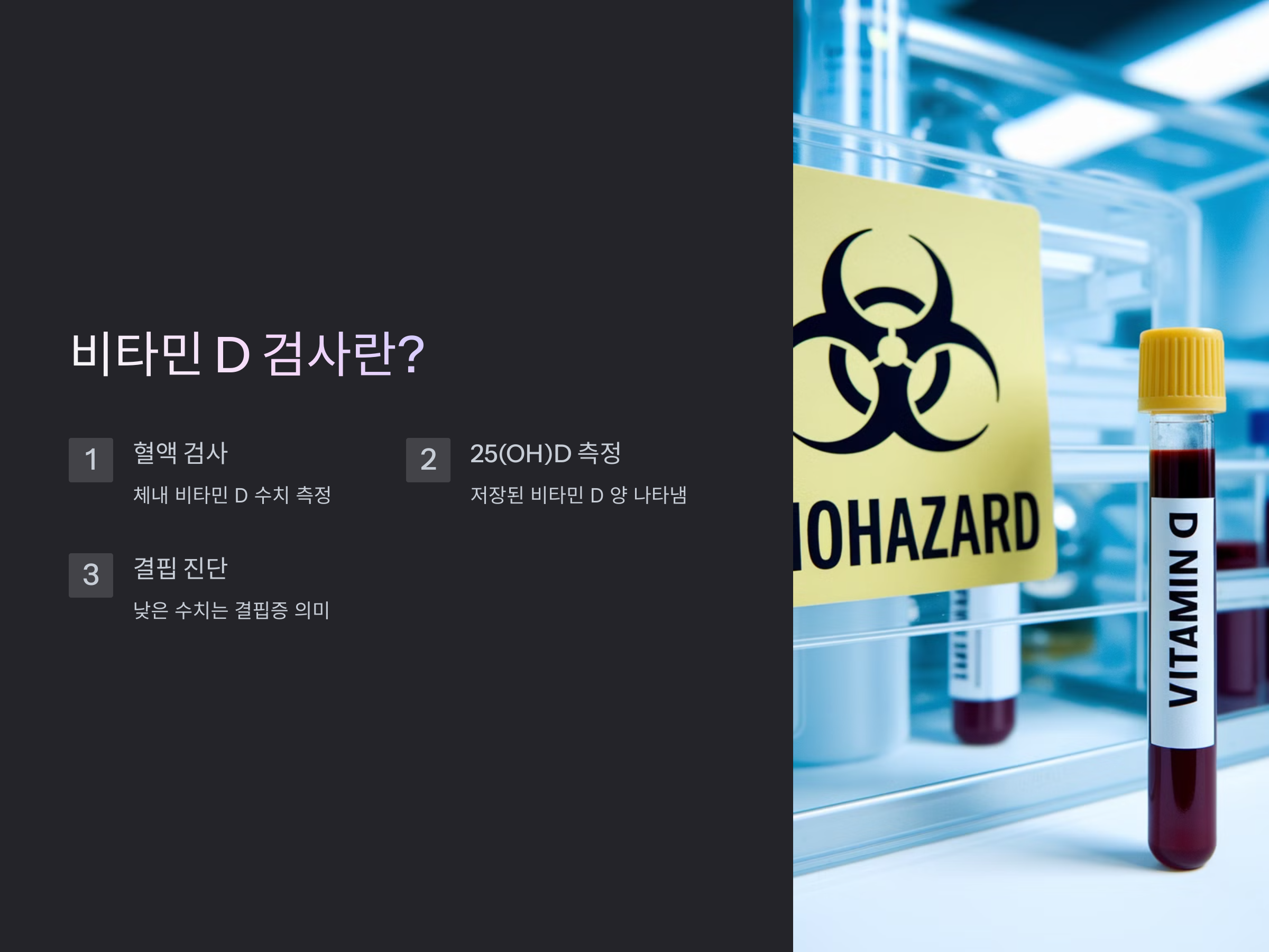 비타민 D 검사는 혈액을 채취하여 체내 비타민 D 수치를 측정하는 검사입니다. 이 검사를 통해 비타민 D 결핍 여부를 파악하고, 필요한 경우 비타민 D 보충제를 처방받을 수 있습니다. 비타민 D는 주로 햇볕을 통해 합성되지만, 계절에 따라 햇볕을 충분히 받지 못하거나, 식사를 통해 충분한 양을 섭취하지 못할 경우 결핍될 수 있습니다.