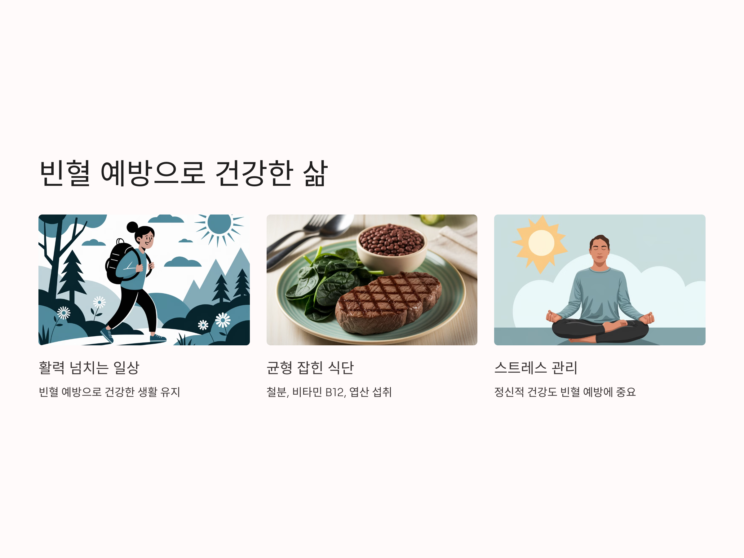 가장 중요한 것은 균형 잡힌 식사입니다. 철분, 비타민 B12, 엽산 등이 풍부한 음식을 섭취하는 것이 빈혈 예방에 가장 효과적입니다.