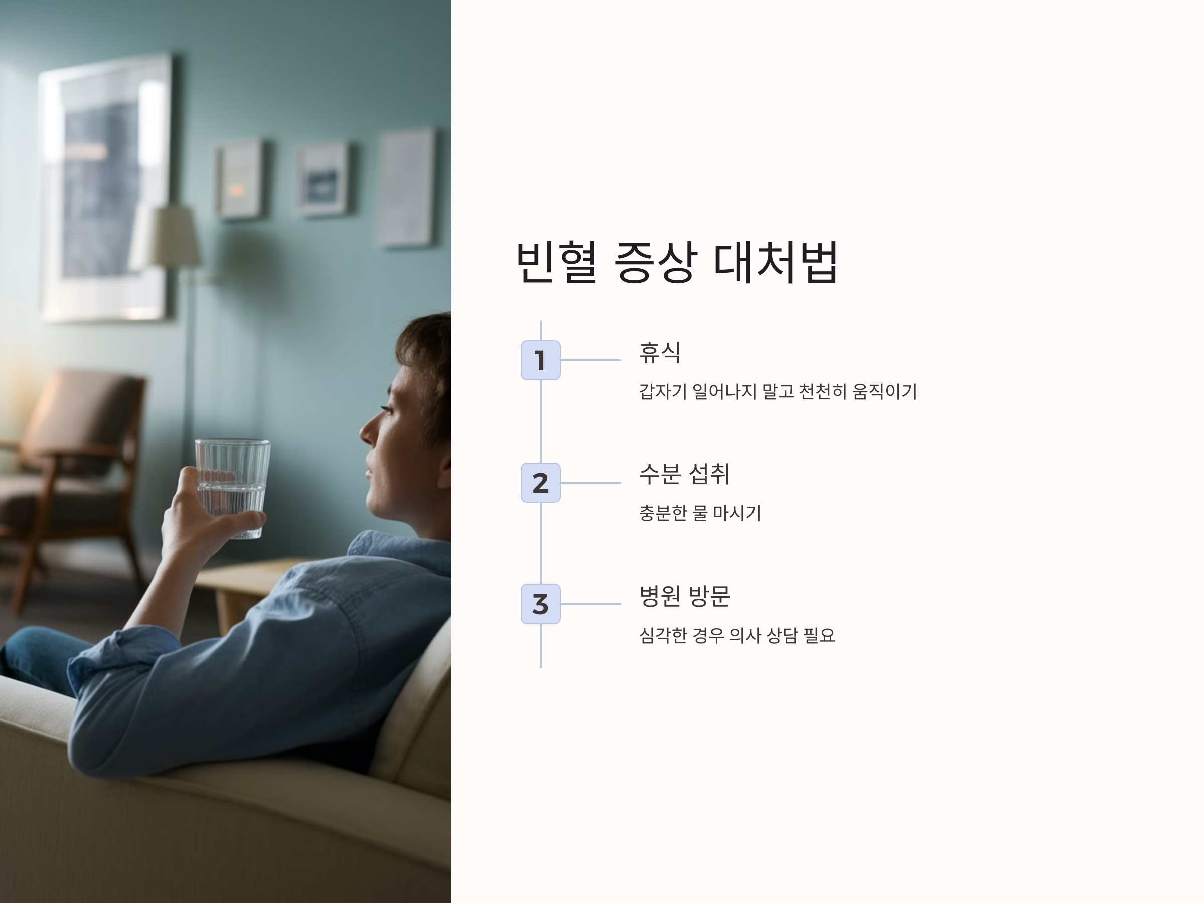 어지러움이 심할 때는 갑자기 일어나지 말고, 천천히 일어나며 잠시 쉬는 것이 좋습니다. 또한, 충분한 수분 섭취와 적절한 휴식은 어지러움을 완화하는 데 도움이 됩니다.