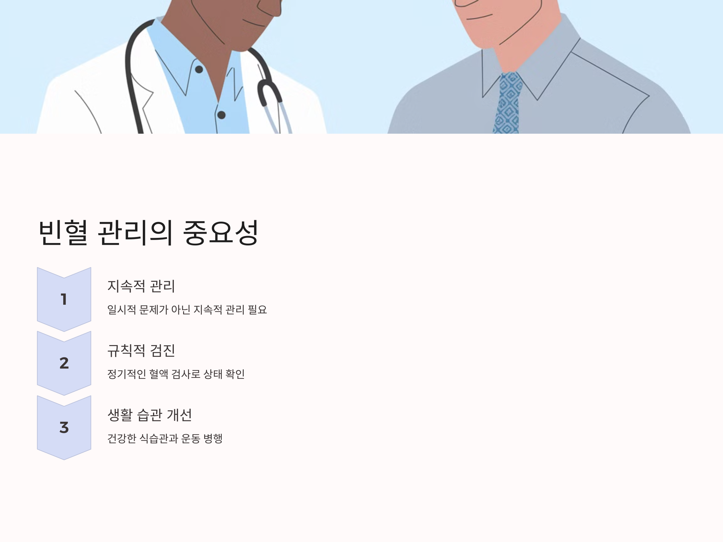 빈혈은 일시적인 문제가 아니라 지속적인 관리가 필요한 질환입니다. 규칙적인 검진과 건강한 생활 습관을 통해 빈혈을 예방하고, 어지러움을 피하는 것이 중요합니다.