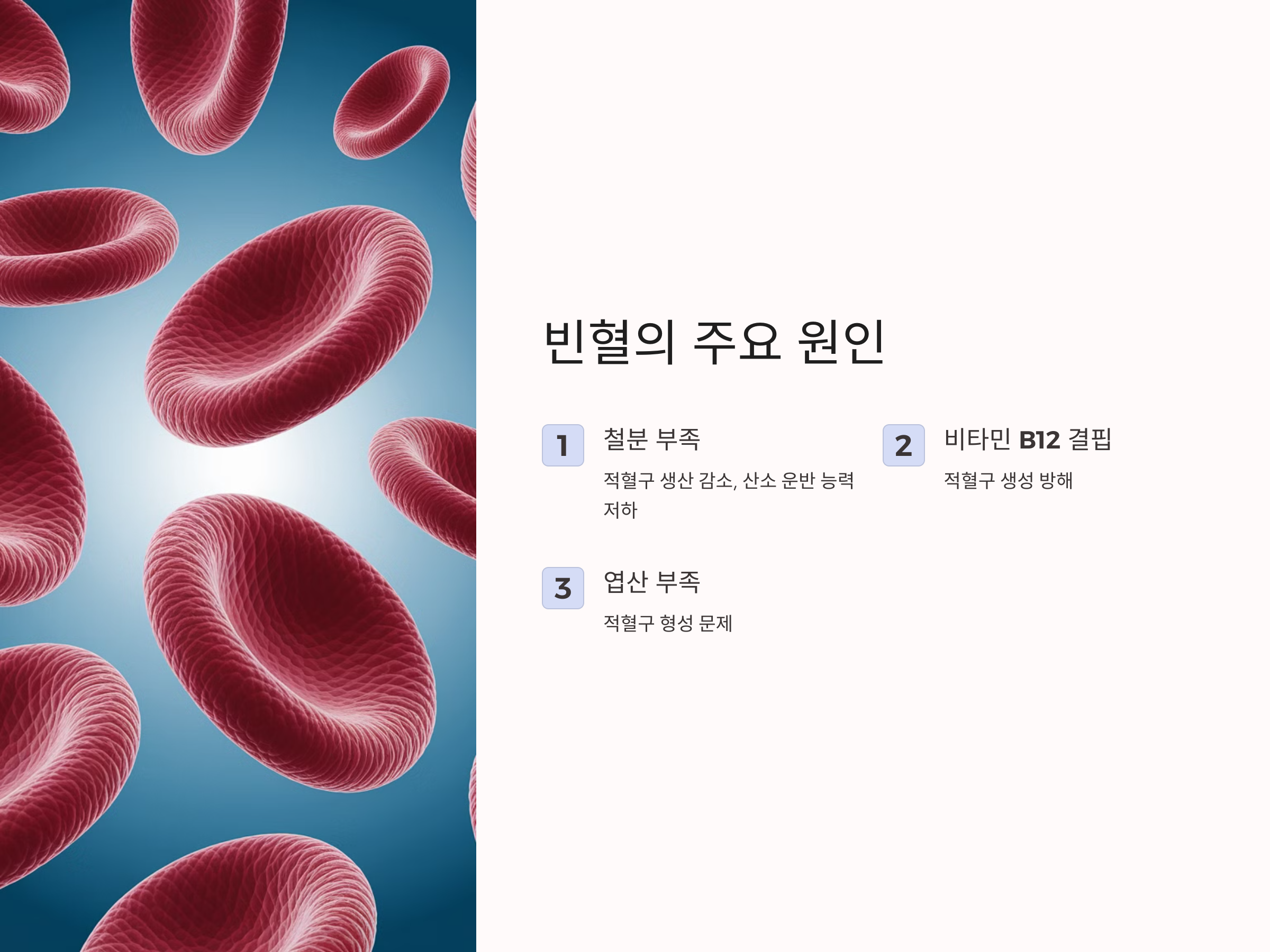 빈혈의 원인은 매우 다양합니다. 가장 일반적인 원인으로는 철분 부족, 비타민 B12 부족, 엽산 결핍 등이 있습니다. 이 외에도 만성질환, 출혈, 임신 등도 빈혈을 유발할 수 있습니다. 빈혈이 발생하면 적혈구가 부족하게 되어 산소를 충분히 공급할 수 없기 때문에 어지러움, 피로감 등이 나타날 수 있습니다.