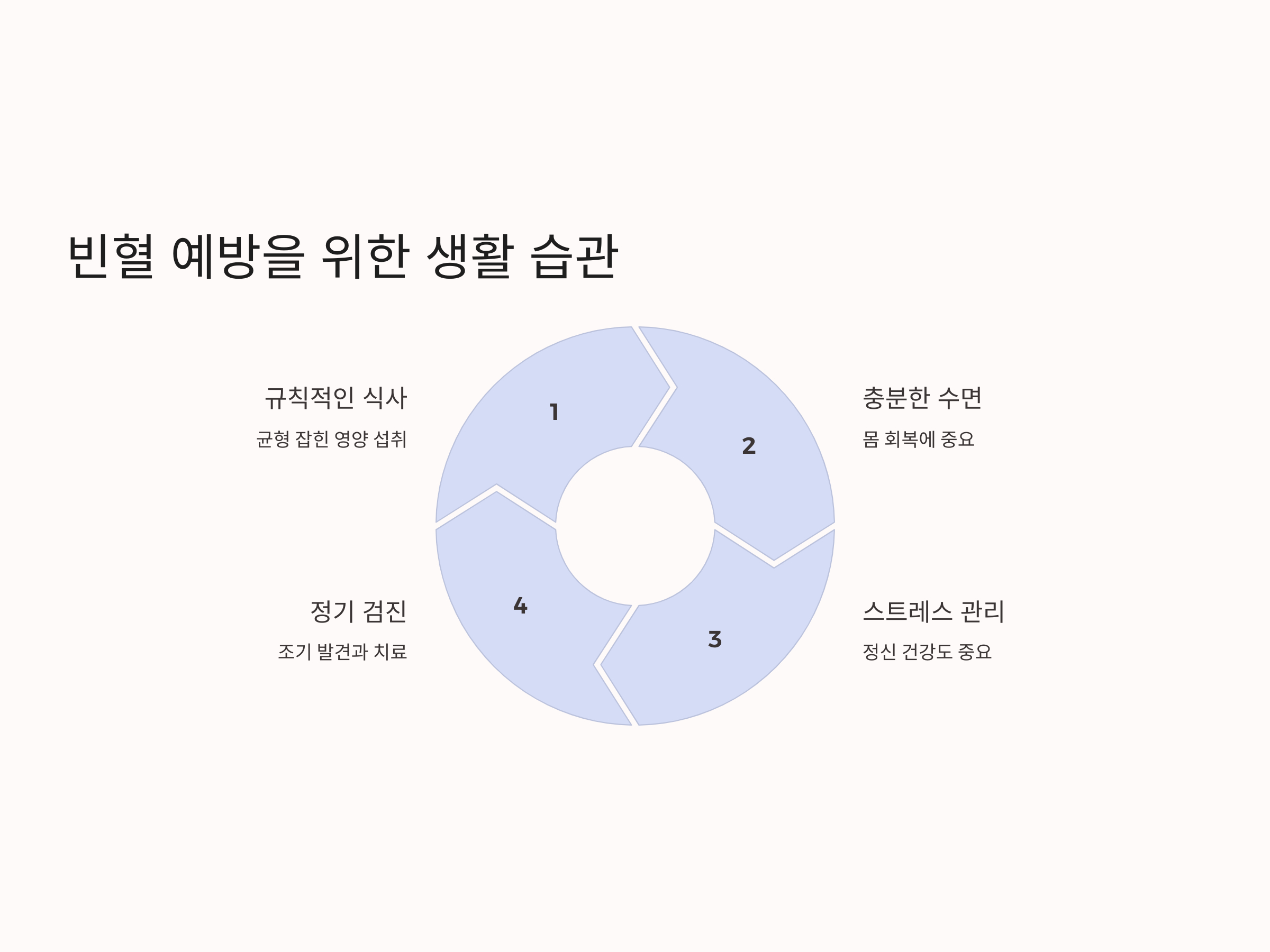 빈혈을 예방하기 위한 생활 습관은 매우 중요합니다. 충분한 수면과 스트레스 관리, 규칙적인 운동을 통해 몸 상태를 최적화하는 것이 필요합니다. 또한, 정기적인 검진을 통해 빈혈을 조기에 발견하고 치료하는 것이 좋습니다.