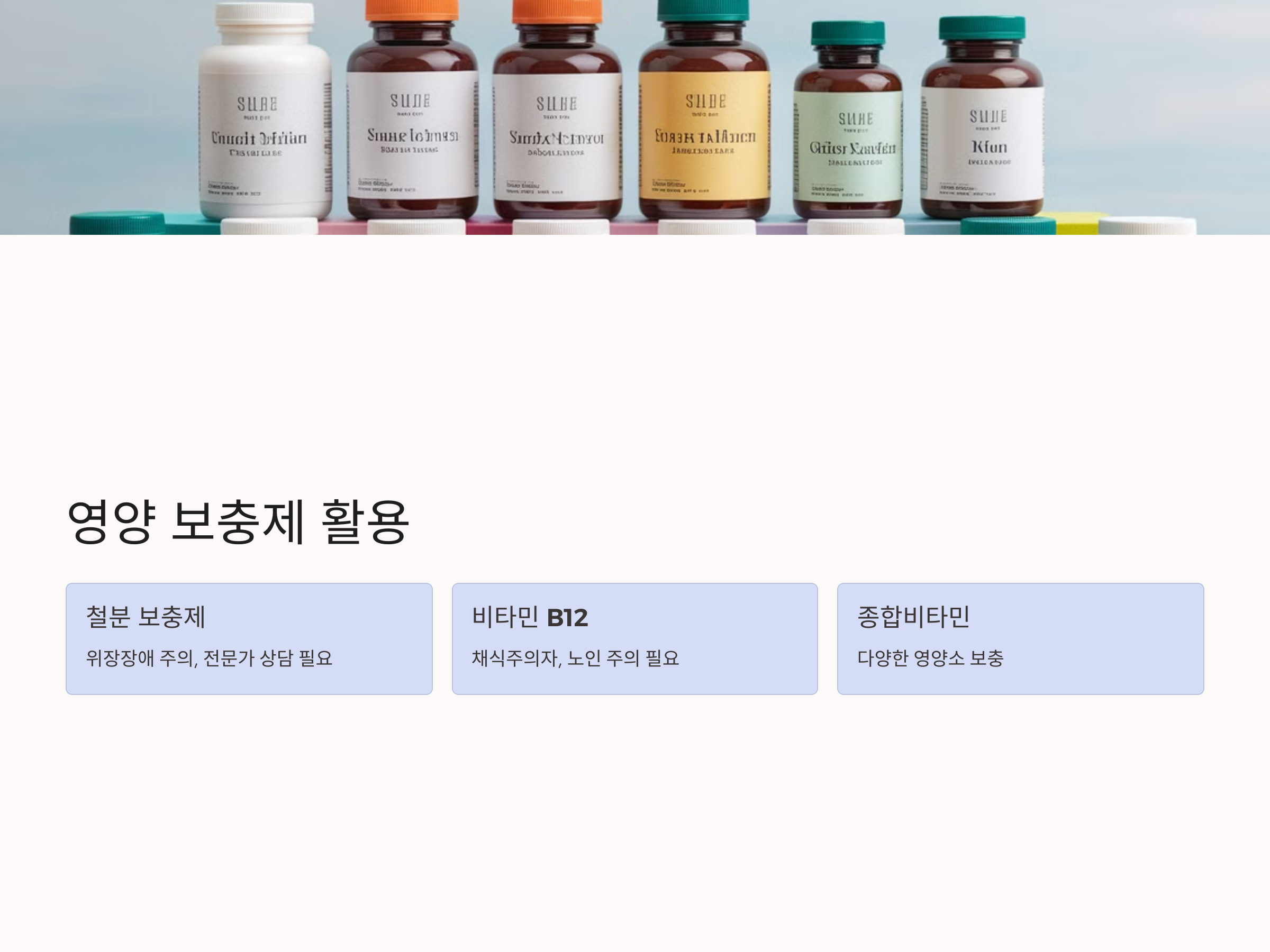 비타민 B12가 부족한 경우, B12 보충제를 복용할 수 있습니다. 특히, 채식주의자나 나이가 많은 사람들은 B12가 부족할 수 있으므로 주의가 필요합니다.