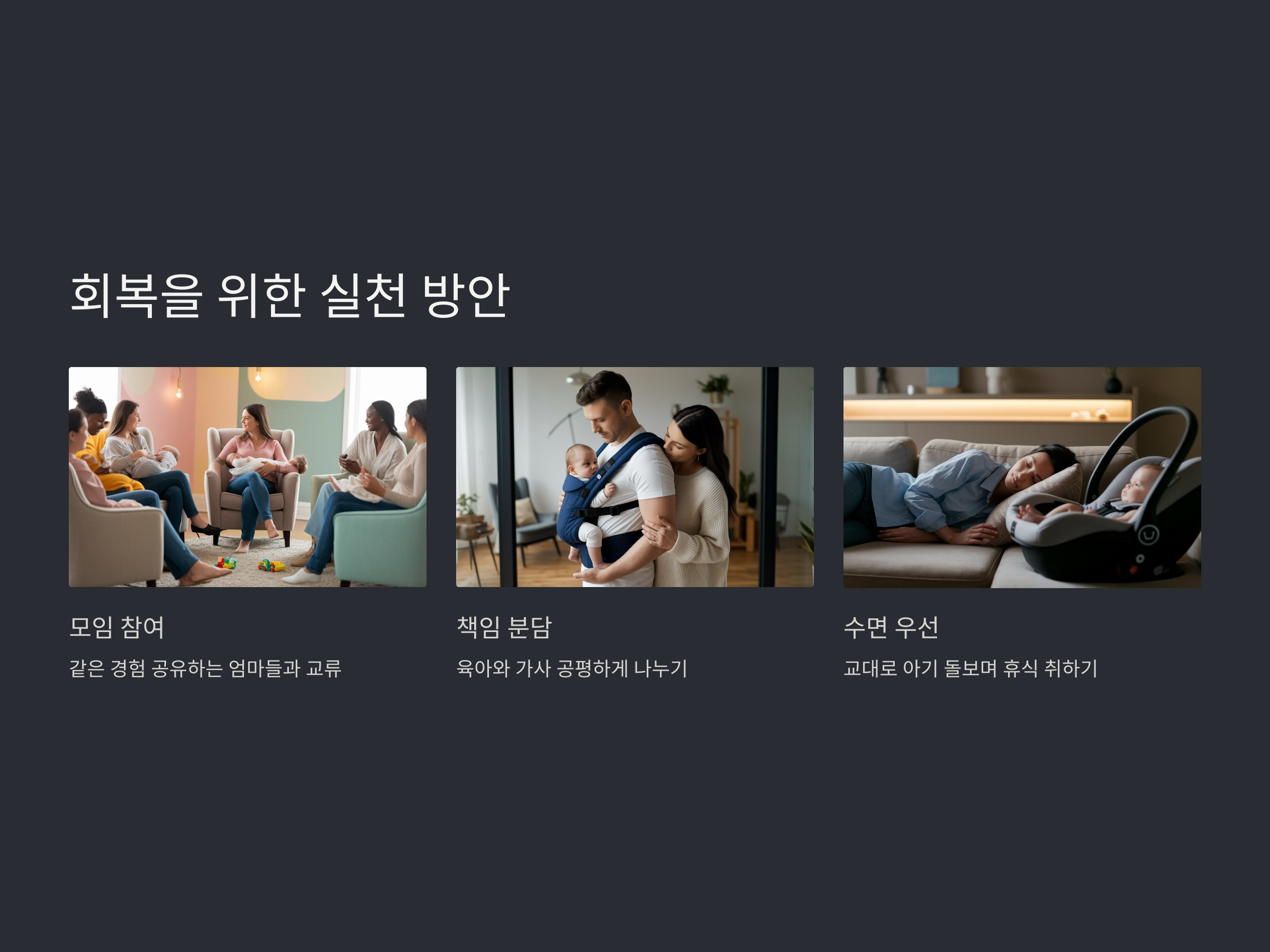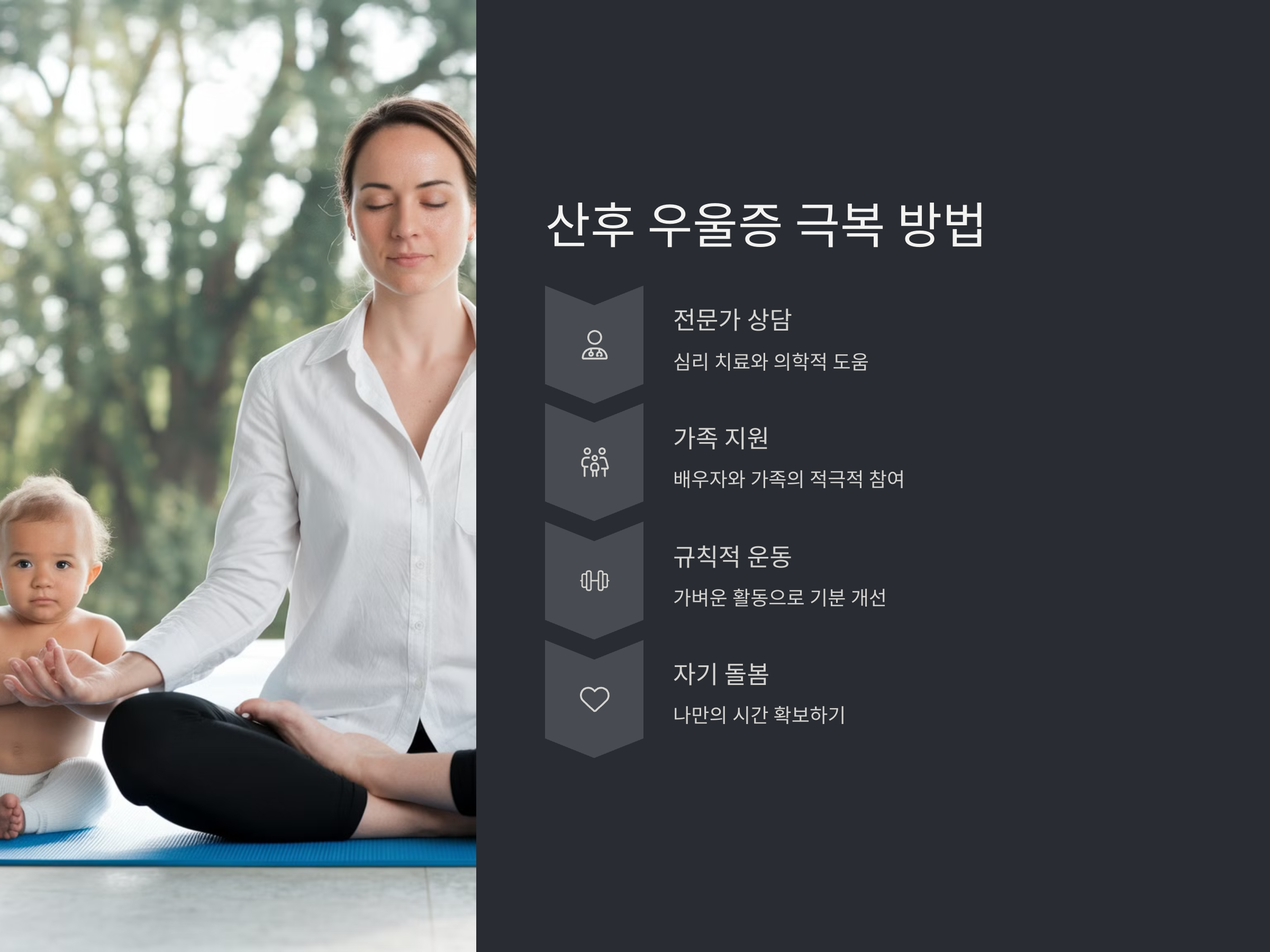 정기적인 운동과 건강한 식습관 또한 산후 우울증을 극복하는 데 중요한 역할을 합니다. 운동은 스트레스를 줄이고, 기분을 개선하는 데 도움을 줄 수 있습니다. 또한, 충분한 수면을 취하는 것도 매우 중요합니다. 수면 부족이 우울감을 악화시키지 않도록 주의해야 합니다.