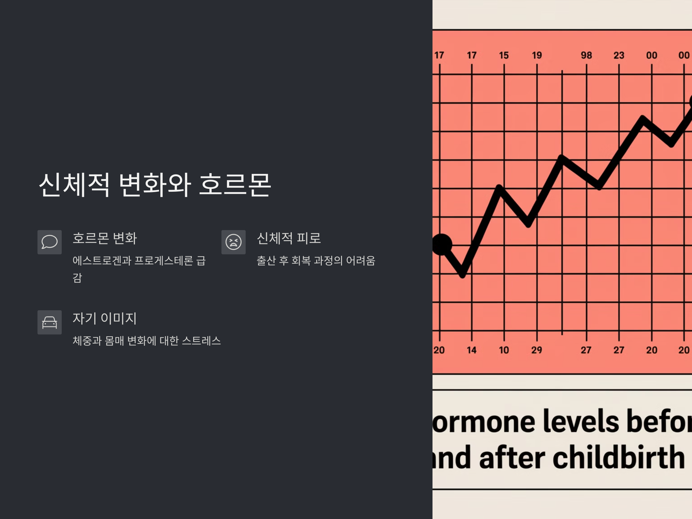 출산 후 신체의 변화는 산후 우울증의 가장 큰 원인 중 하나입니다. 임신 중에 급격히 변화했던 호르몬 수준이 출산 후 급격히 떨어지면서 여성의 몸은 여러 가지 스트레스를 경험하게 됩니다. 특히, 에스트로겐과 프로게스테론 호르몬의 급격한 감소는 감정적인 불안정을 초래할 수 있습니다. 이러한 호르몬 변화는 기분을 불안정하게 하고, 불안감, 우울감, 피로감을 증대시킬 수 있습니다.
