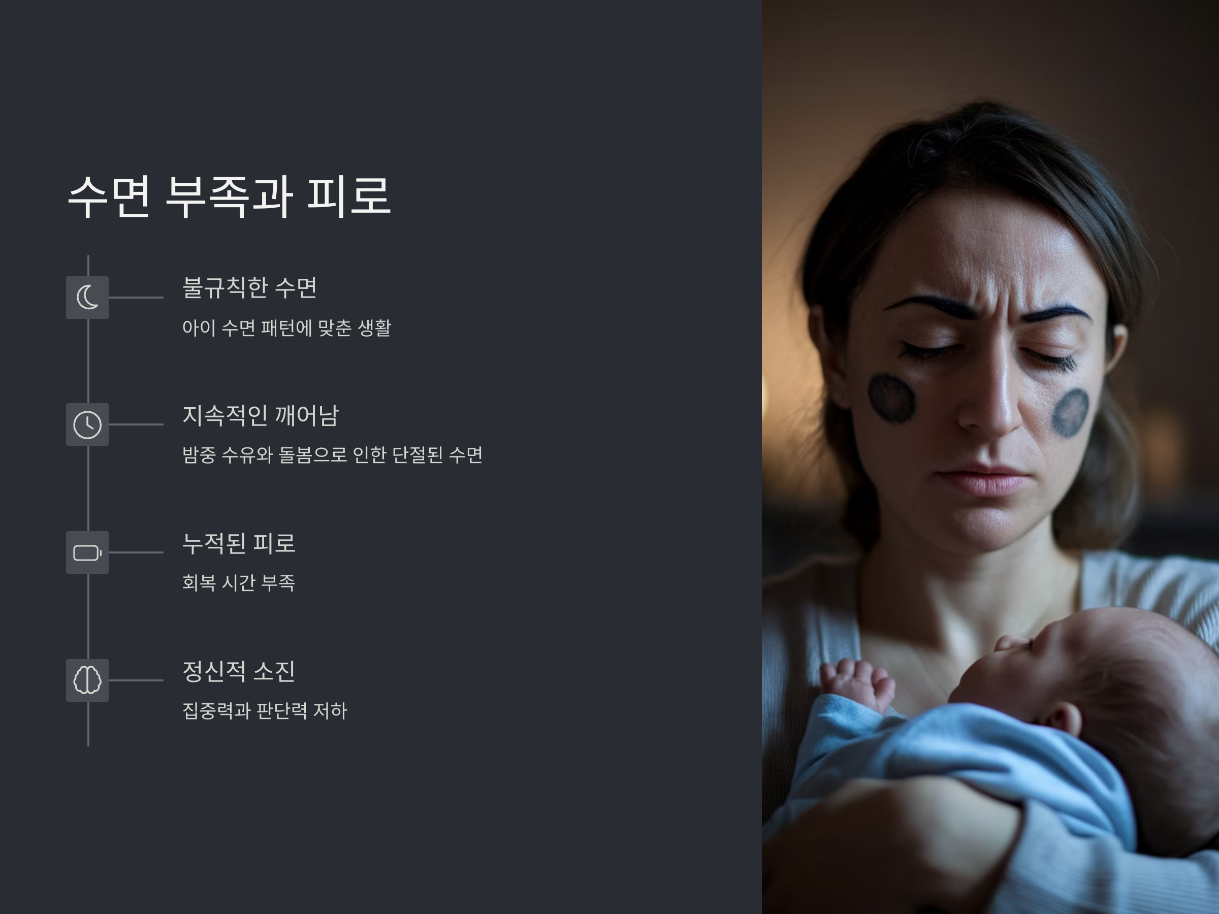 산후 우울증의 또 다른 중요한 원인 중 하나는 수면 부족과 신체적인 피로입니다. 출산 후, 여성들은 아이의 수면 패턴에 맞추어 생활해야 하므로, 자주 깨거나 밤을 새우는 경우가 많습니다. 이로 인해 심각한 수면 부족이 발생하고, 피로가 누적되면서 우울감이 더 심해질 수 있습니다.