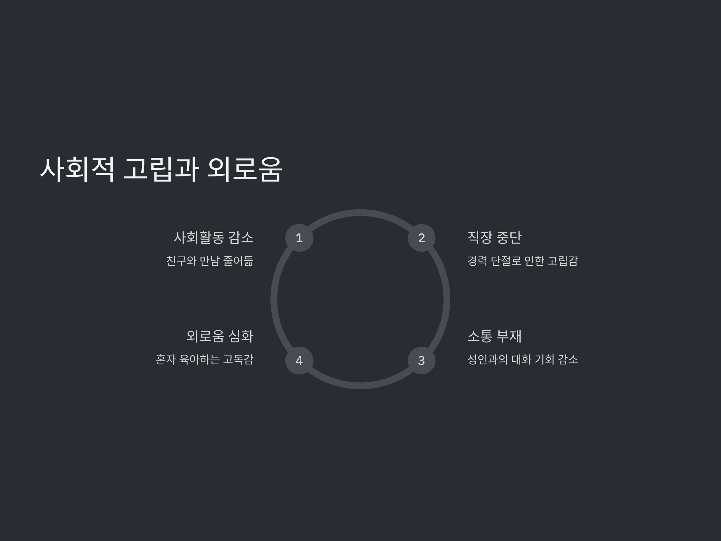 사회적 고립은 산후 우울증을 악화시킬 수 있는 중요한 원인입니다. 혼자서 아이를 돌보는 것이 어렵고 외로움이 깊어지면, 우울한 감정이 계속해서 커져 나가게 됩니다.