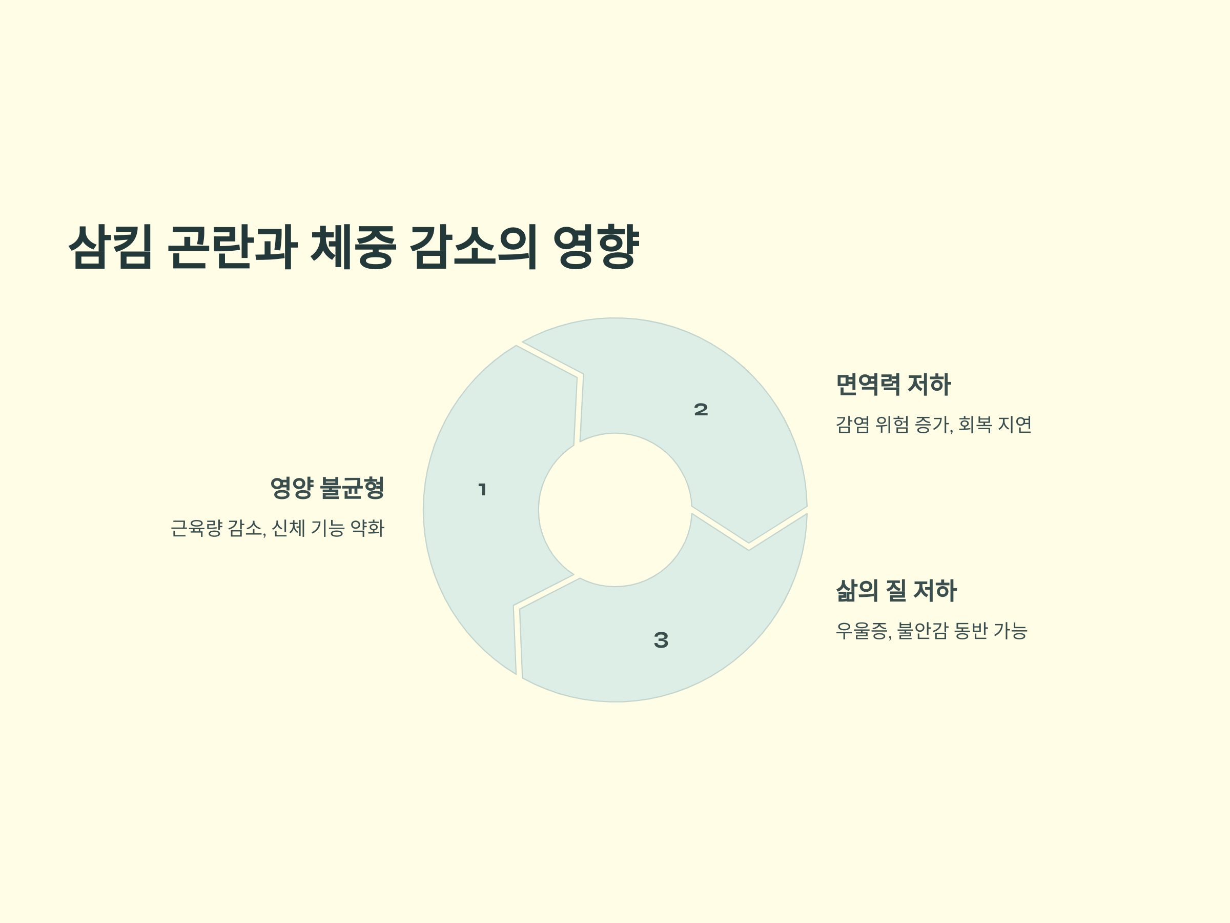 - 지속적인 영양 부족은 근육량 감소(근감소증)로 이어져 전반적인 신체 기능을 약화시킵니다.